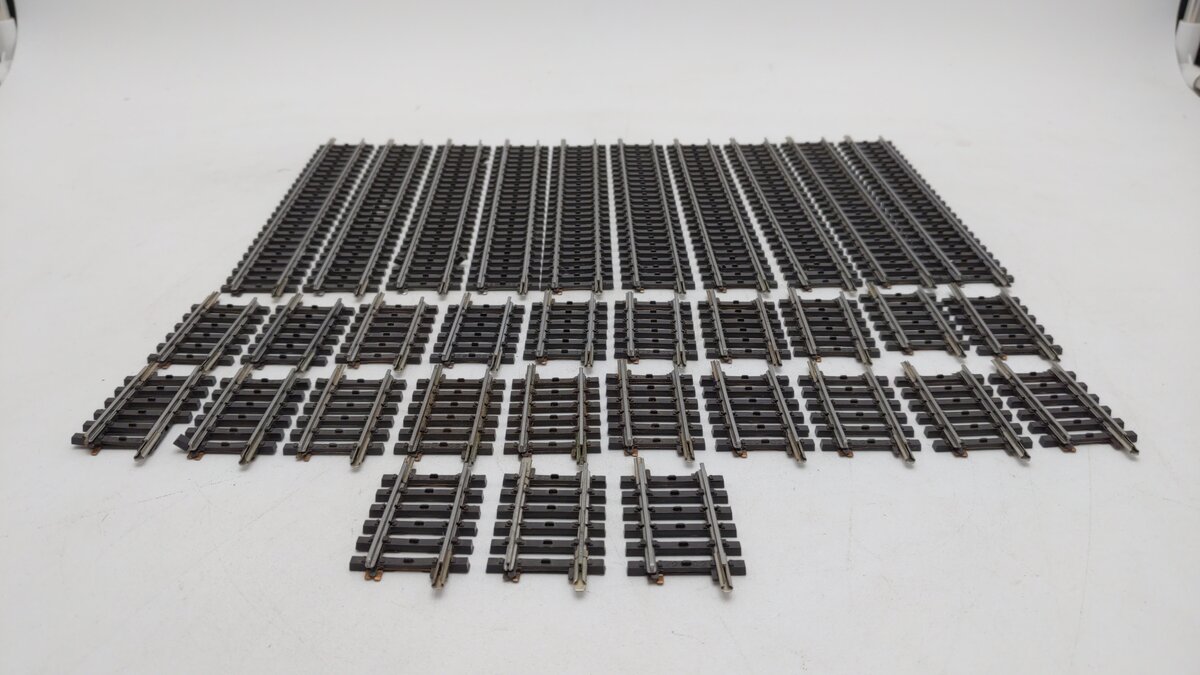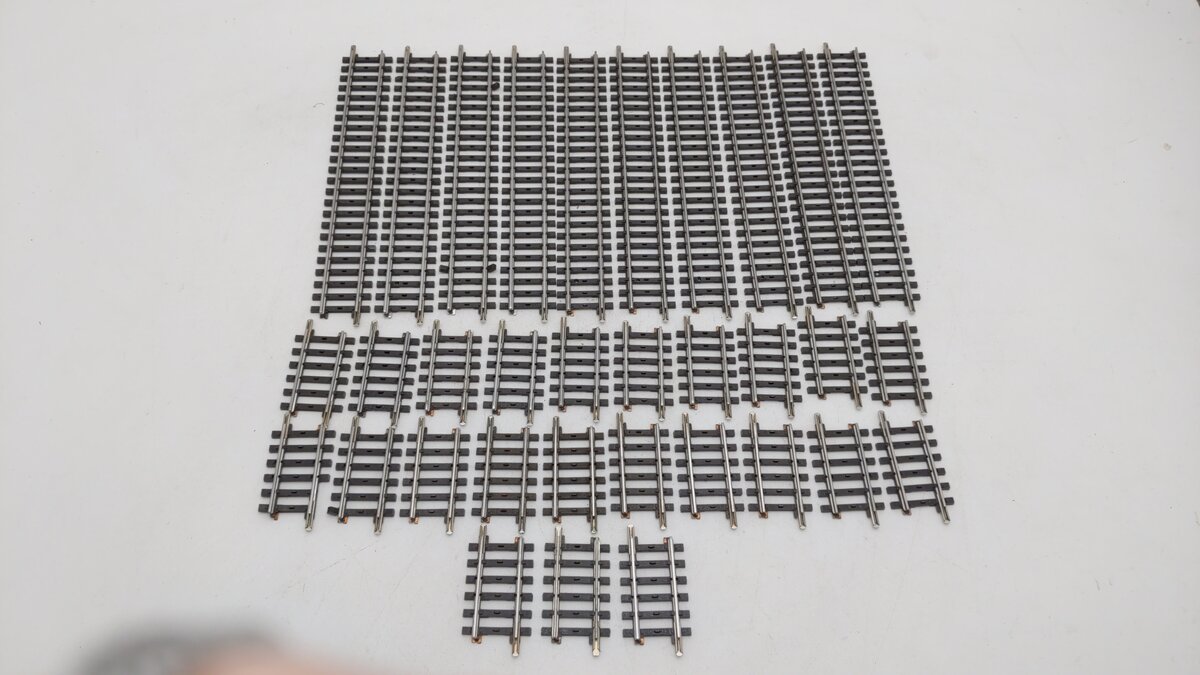 Here we have a Marklin 2200, 2202 HO Assorted Straight K Track Section [33]. These track sections feature a metal railing and and plastic railroad ties to resemble the real ties.