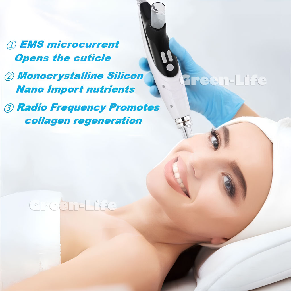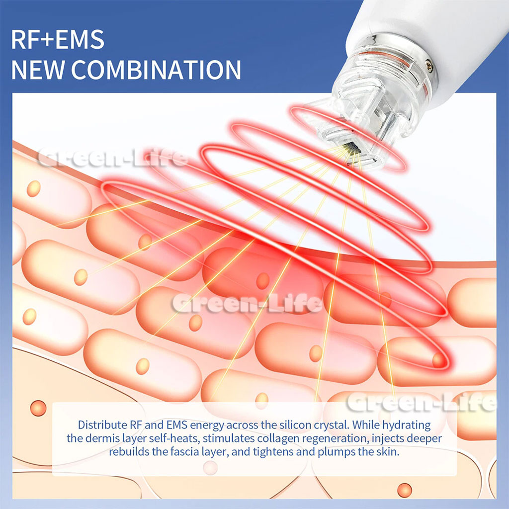 3.RF+EMS -- New combination. Distribute RF and EMS energy across the silicon crystal. While hydrating, the dermis layer self-heats, stimulates collagen regeneration, injects deeper, rebuilds the fascia layer, and tightens and plumps the skin.