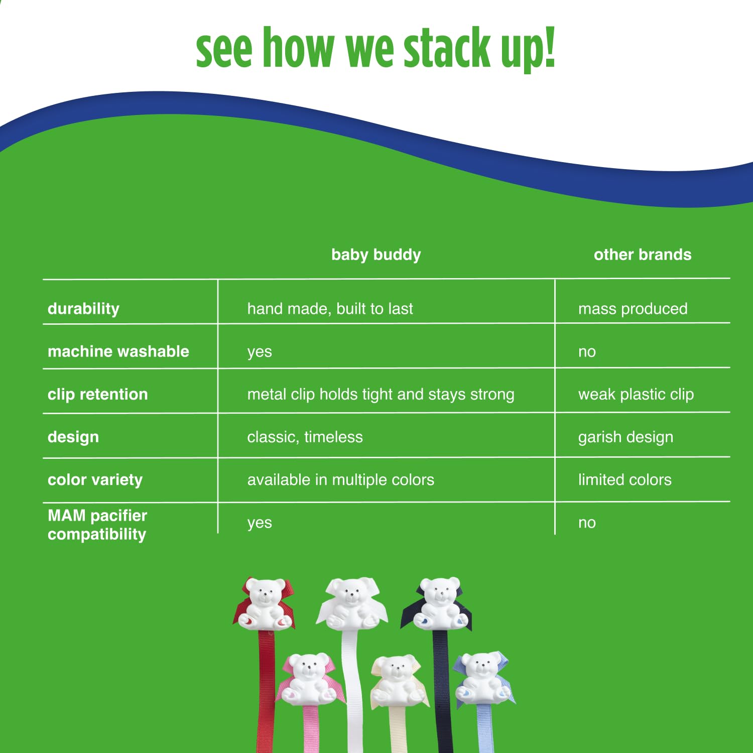 Baby Buddy's Pacifier Holder clips ANY pacifier to baby's shirt safely, easily, and quickly. No more lost pacifiers or carrying around multiple pacifiers because baby drops them on the dirty ground. A durable, "Super Grip" metal clip featuring a cute, three-dimensional bear attaches securely to baby's clothing, car seat cover or stroller, and the other ends snaps neatly and easily to the pacifier handle or the pacifier shield, as with silicone pacifiers with holes in shield. Baby Buddy's Pacifier Holder keeps your baby's binkie close at hand and safe from ground contamination. Simply hand-wash in warm, soapy water and allow to air dry to keep the Pacifier Holder clean and attractive. Comes in a wide range off colors to match every outfit and occasion. Check out our other Baby Buddy products because Every Baby Needs a Buddy.