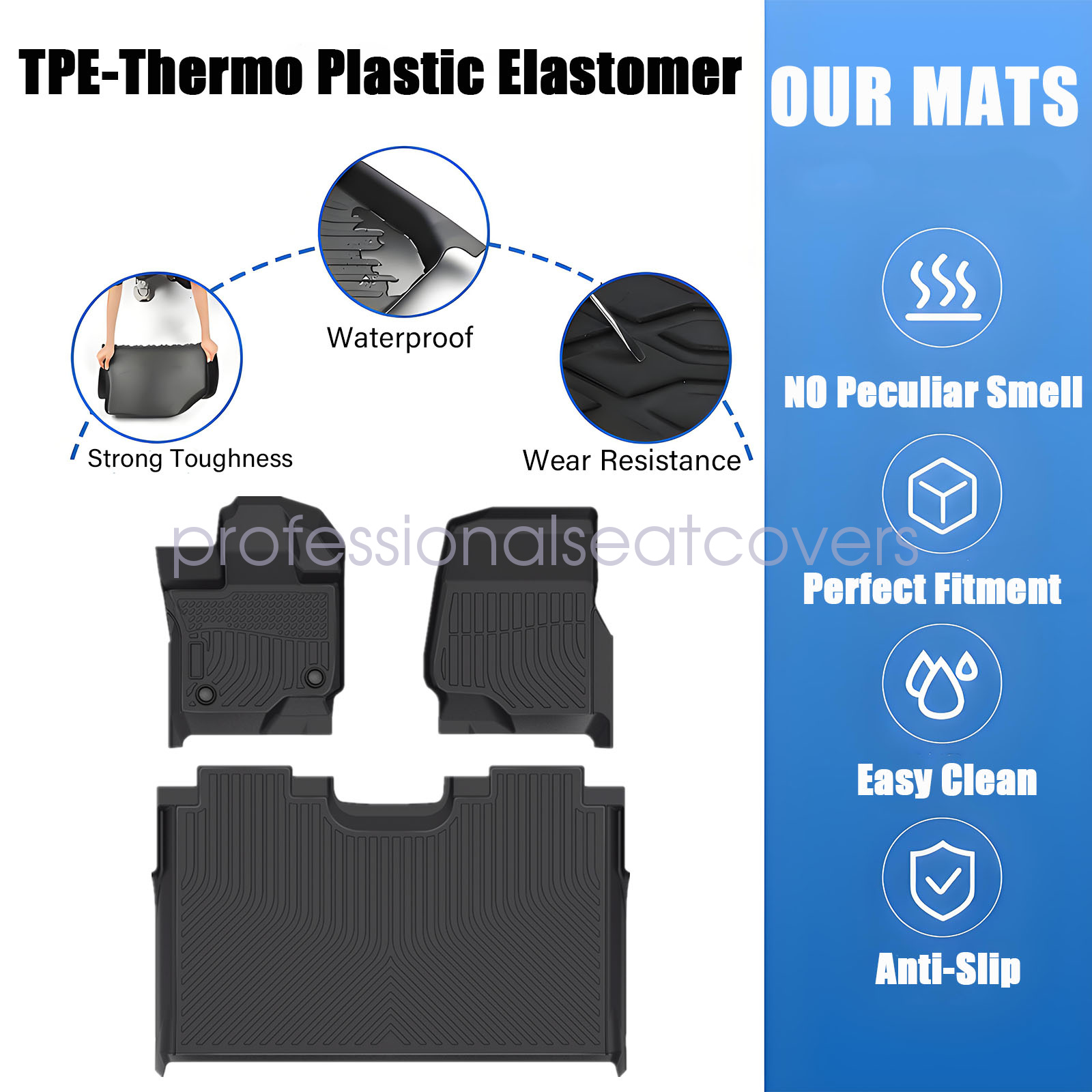 Soillar floor mats use elastic TPE (Thermoplastic Elastomer), No foul odor is produced even at high temperatures. soft touch and exquisite finish. This floor mats are skid-proof and recyclable.