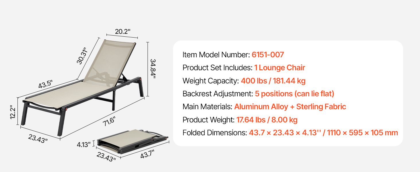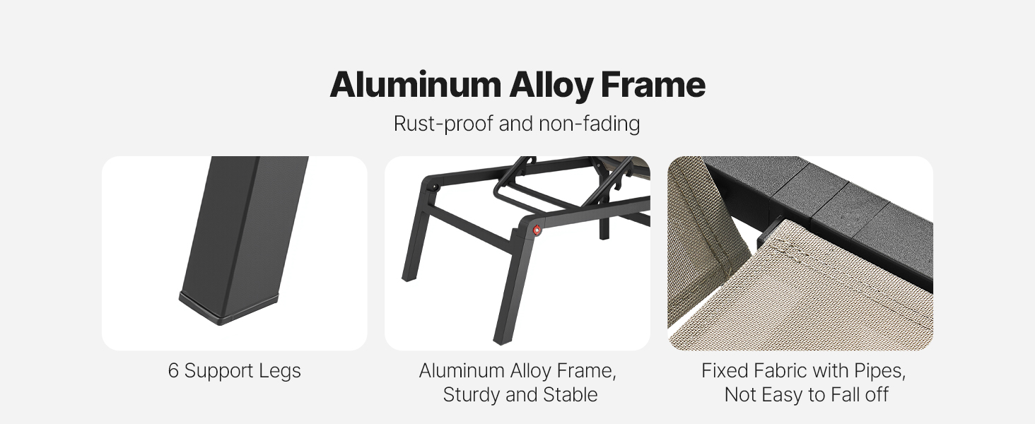 - Struttura in lega di alluminio: realizzata con tubi in lega di alluminio robusti e dotata di sei gambe in alluminio, questa sedia a sdraio offre un supporto fino a 181,44 kg, garantendo solidità e lunga durata.