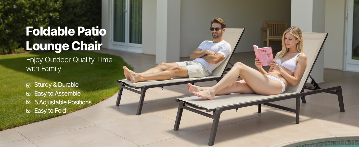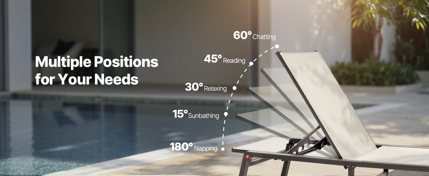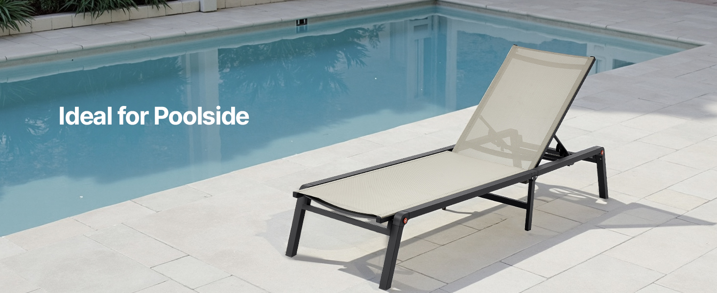 - Semplice da assemblare: configura questa sedia a sdraio in alluminio per piscina in appena tre passaggi, rendendo l'installazione rapida e senza complicazioni. Potrai goderti il tuo nuovo arredo da esterno in pochissimo tempo, dedicando più spazio al relax.