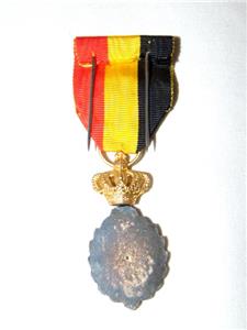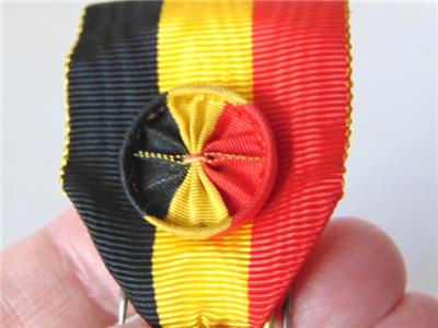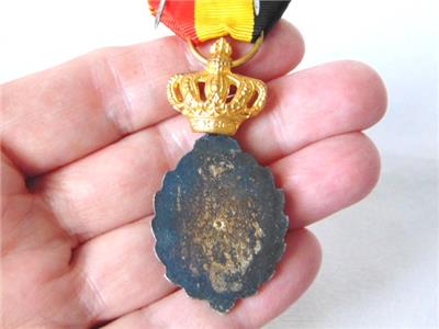 Striking and minty vintage Belgium medal "FOR LABOR DISTINCTION" measuring 4" in size. Featuring an ornate enameled, embossed and pierced oval medal with overlaid gold crossed tool design, top is finished with a lovely crown and jump ring onto which the original black yellow and red ribbon is attached - accented with ribbon wheel and dual straight pins for mounting. Medal bears the words BEKWAAM ZEDELUKHEID HABILETE MORALITE - I believe this was a 25 year labor medal, a decoration by the Belgium labor department for years of service using knowledge, talent and dedication in the pursuit of work.