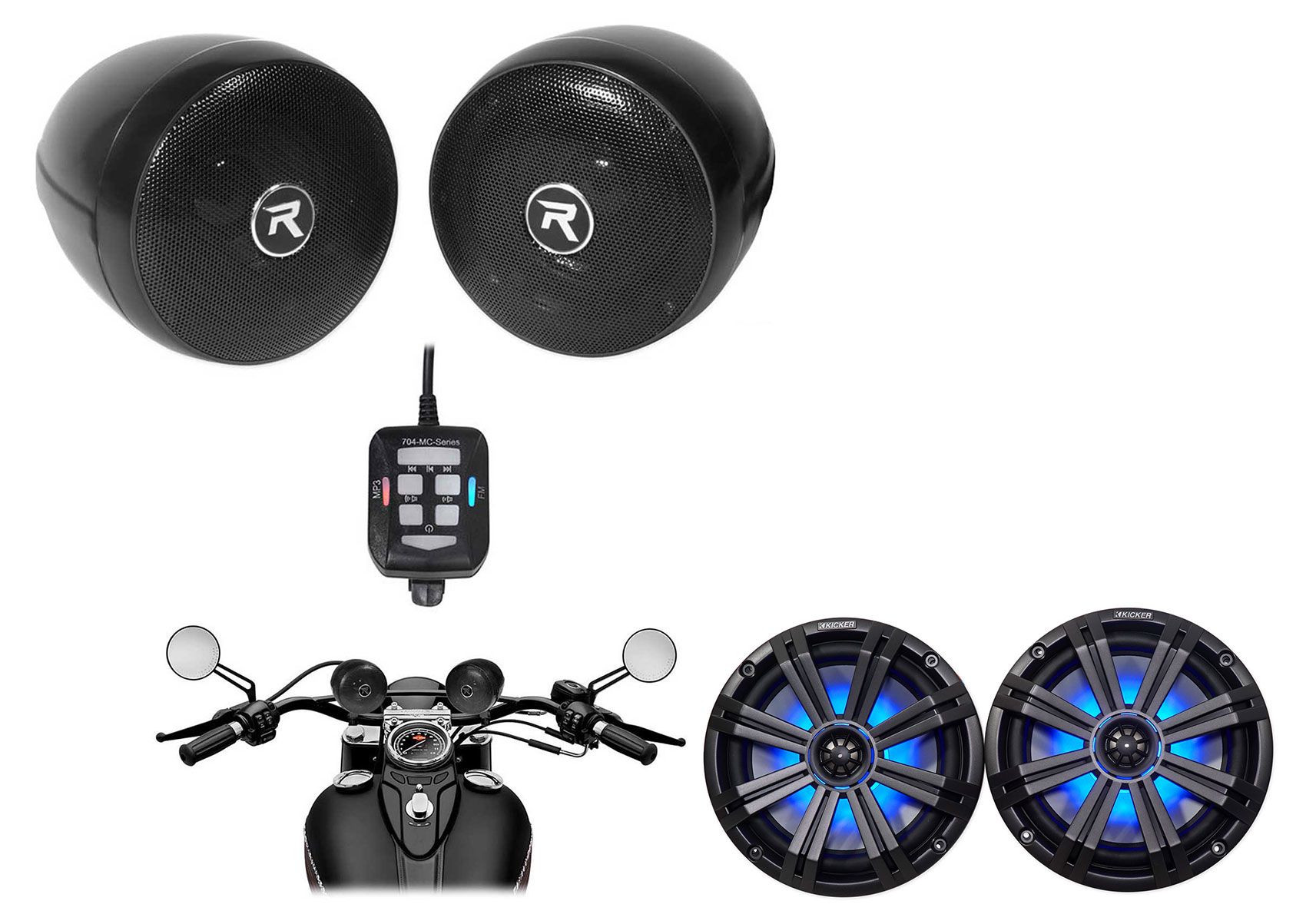 Package: Pair of Kicker 45KM84L 8" 600 Watt Marine Waterproof Speakers w/ LED's + Pair of Rockville RockNRide 3" Metal Powered Bluetooth Motorcycle Handlebar Speakers