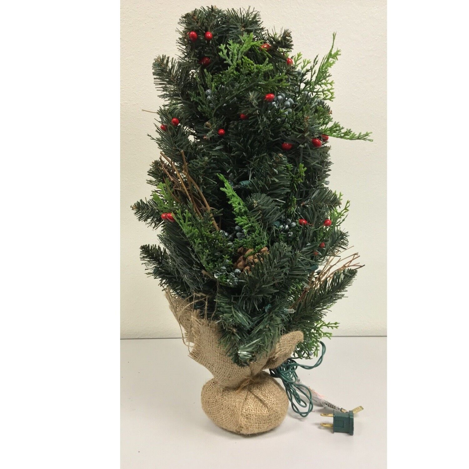 Pre-lit Cedar and Pine Christmas Tree with Burlap BaseLights upAccented with red berries and pine conesMade from plastic and wireApproximately 2 feet tall (24 in)Includes original manufacturers box and packaging