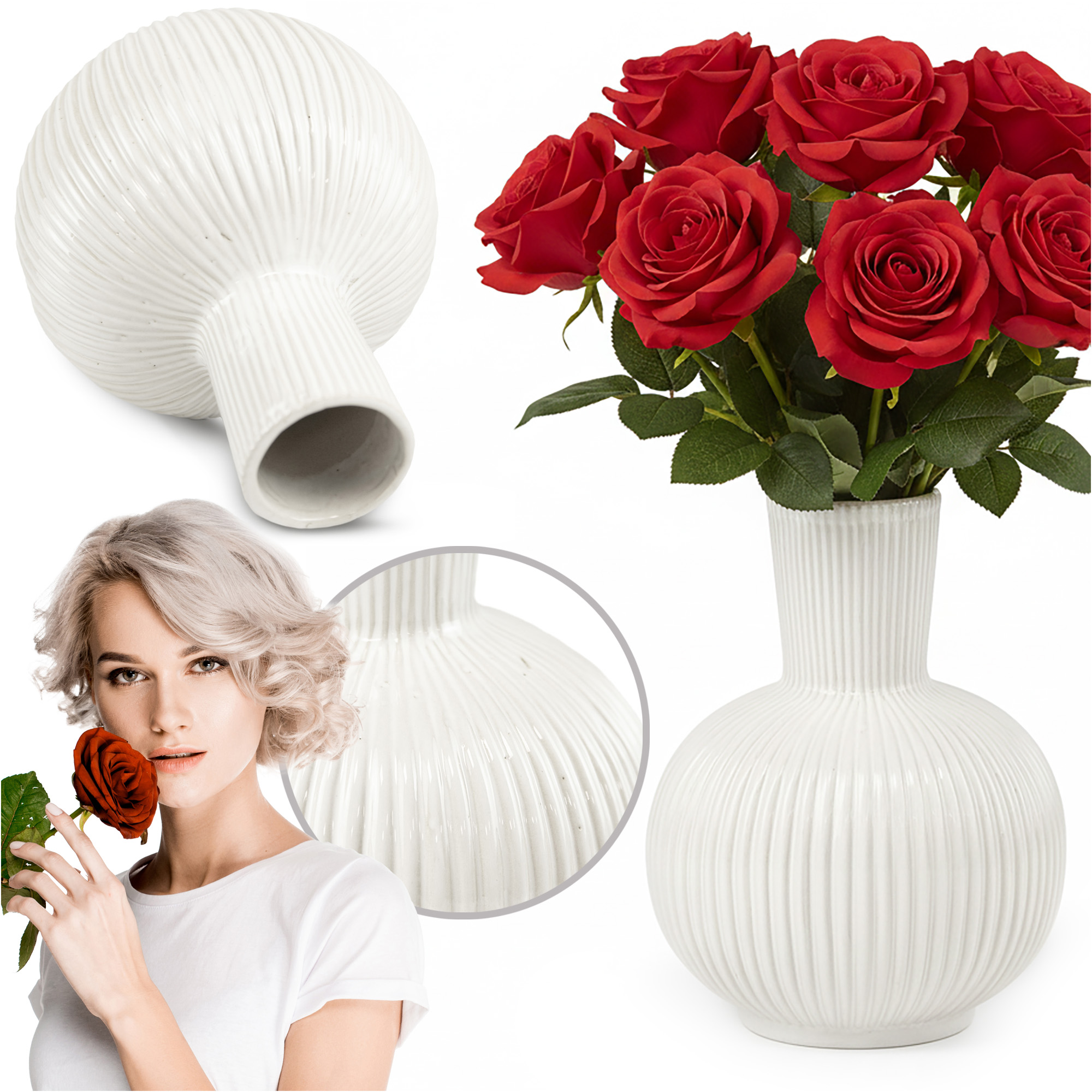 Élégant vase en céramique blanche, décoré de rainures discrètes. Idéal comme pièce décorative et récipient pratique pour les fleurs fraîches ou artificielles.