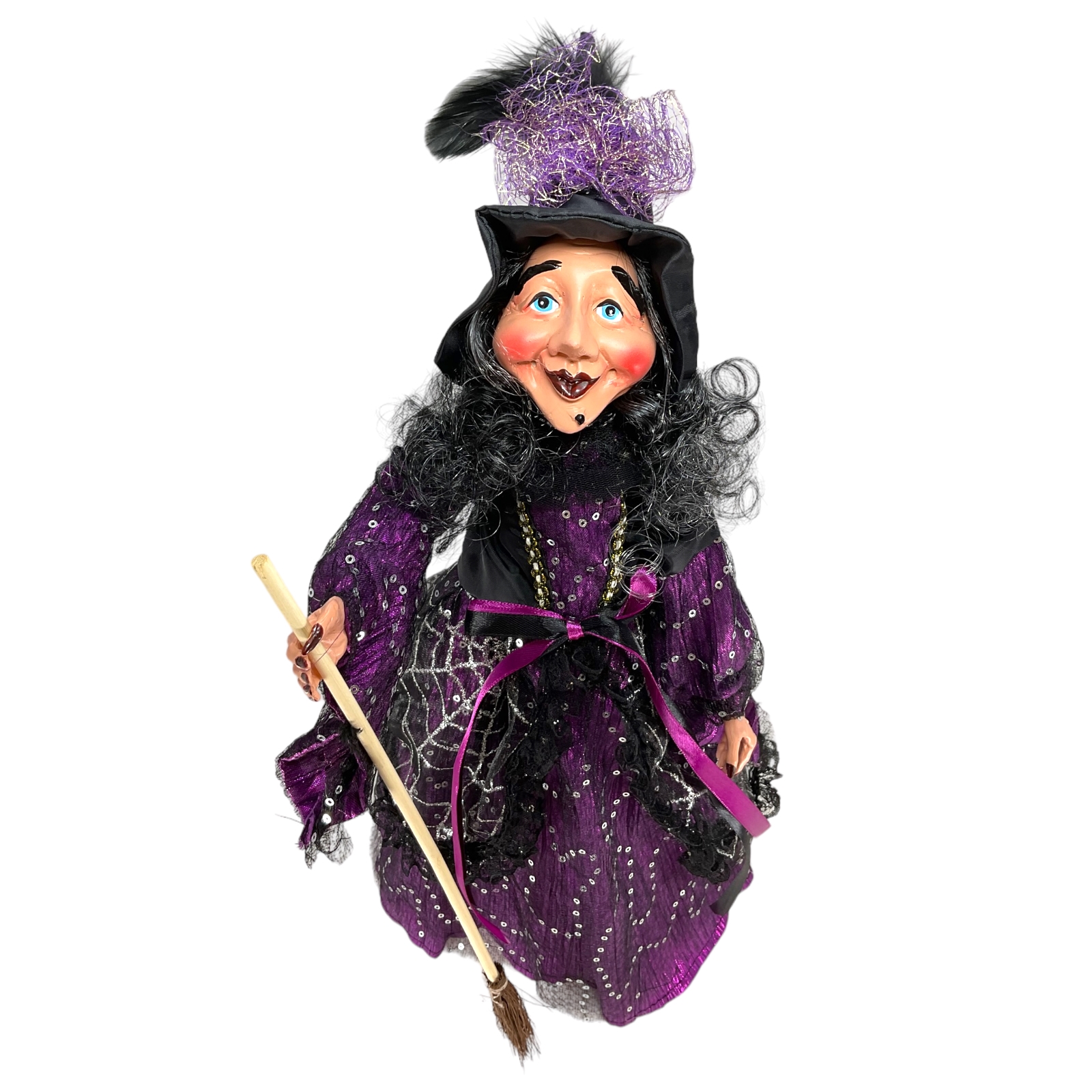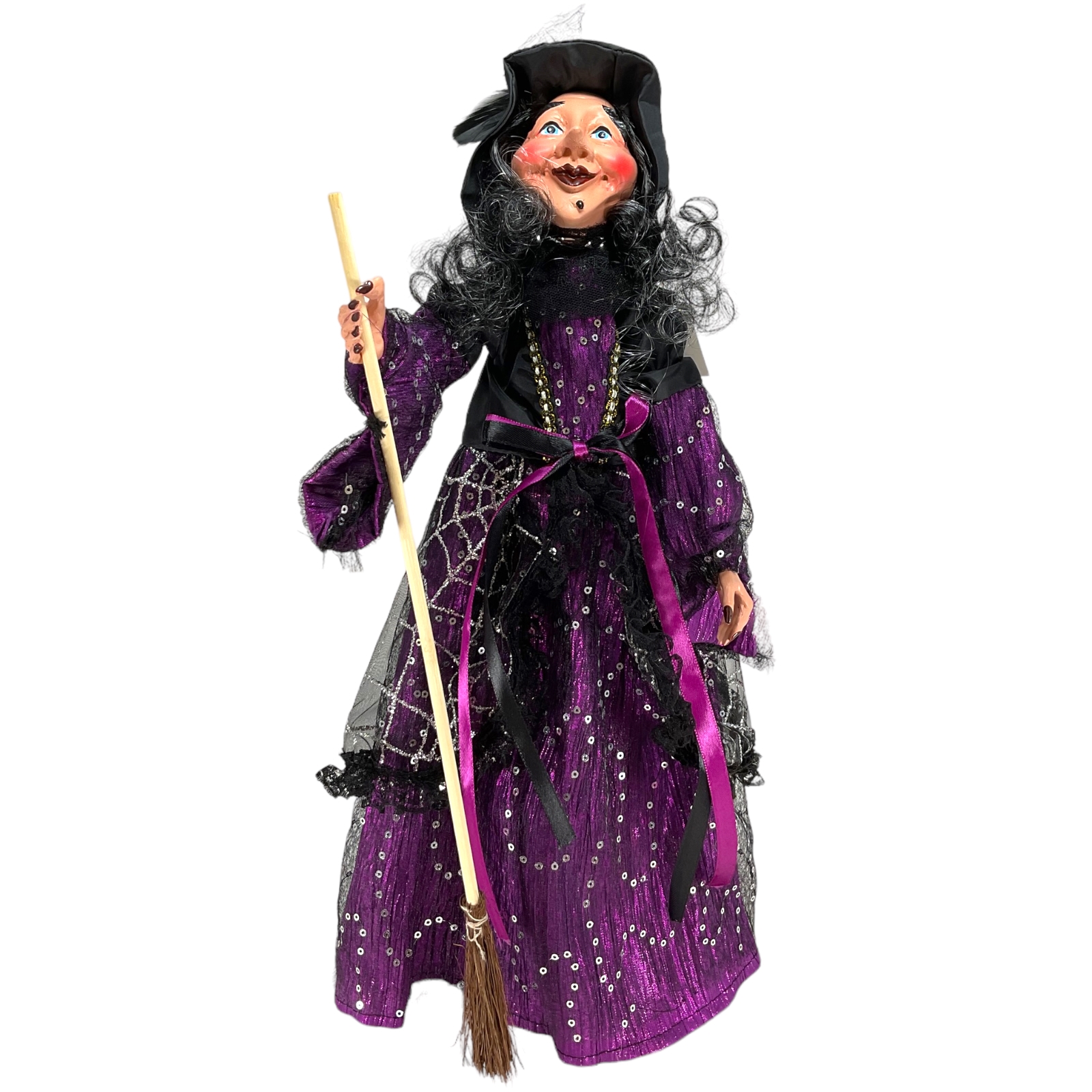 Purple and Black Fabric Witching Holding Broom Halloween Figurine 16 Inch