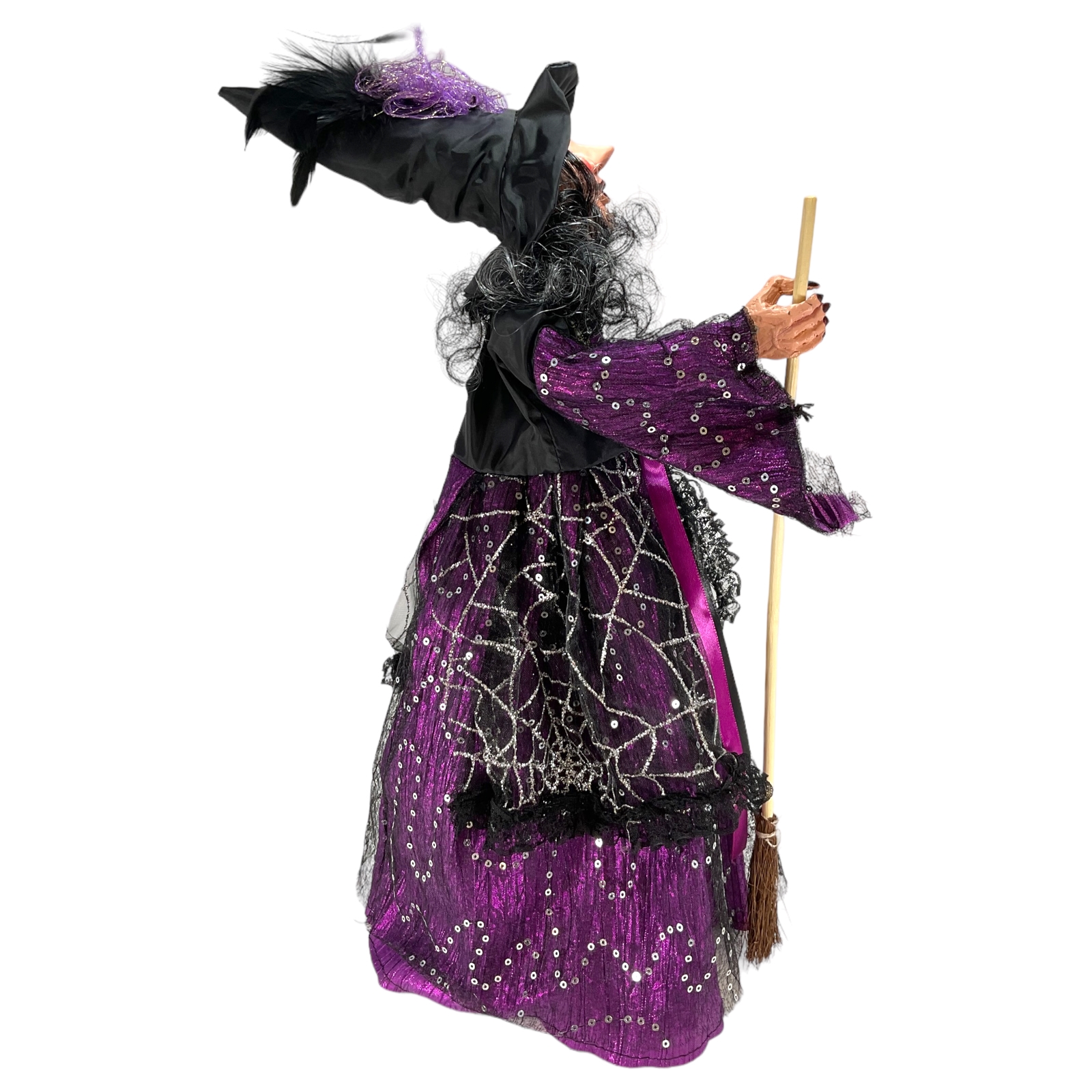 Purple and Black Witch with Broom Display Figurine. Made from plastic and fabric. Stands approximately 16 inches tall x 7 inches wide x 5.5 inches long