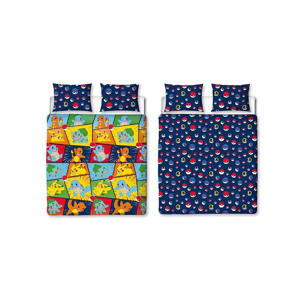 This Pokemon bedding set is perfect for any fans of the animated series and game. This design features images of Pikachu, Bulbasaur, Charmander and Squirtle in a geometric grid pattern, whilst the reverse features a repeat pattern of poke balls, set on a navy blue background. This duvet set can be machine washed and tumble dried on a cool setting.