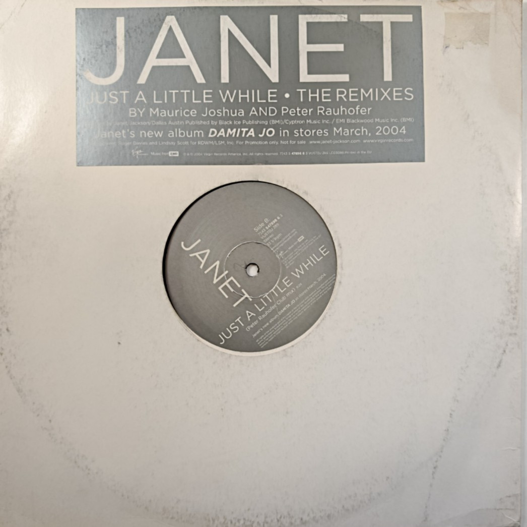 UK promotional 12" single featuring exclusive remixes of Janet Jackson’s 2004 hit Just A Little While. Issued by Virgin Records under catalog number VUSTDJ 285, this promo pressing was designed for DJs and clubs, showcasing extended mixes and dubs.