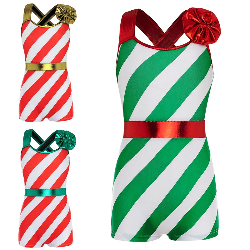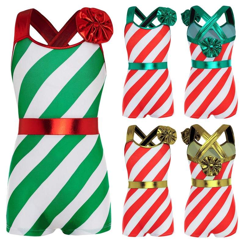 Kids Girls Christmas Wide Shoulder Straps Sleeveless Stripes Print High Waist Jumpsuit.