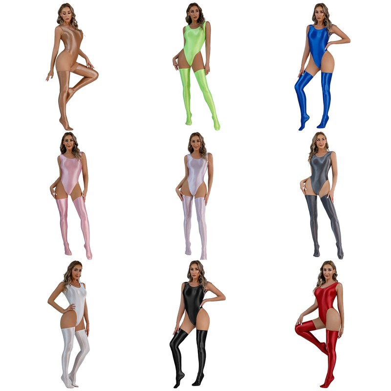 Glossy bodysuit for women, solid color, u neck, sleeveless, high cut design show your legs much slender.