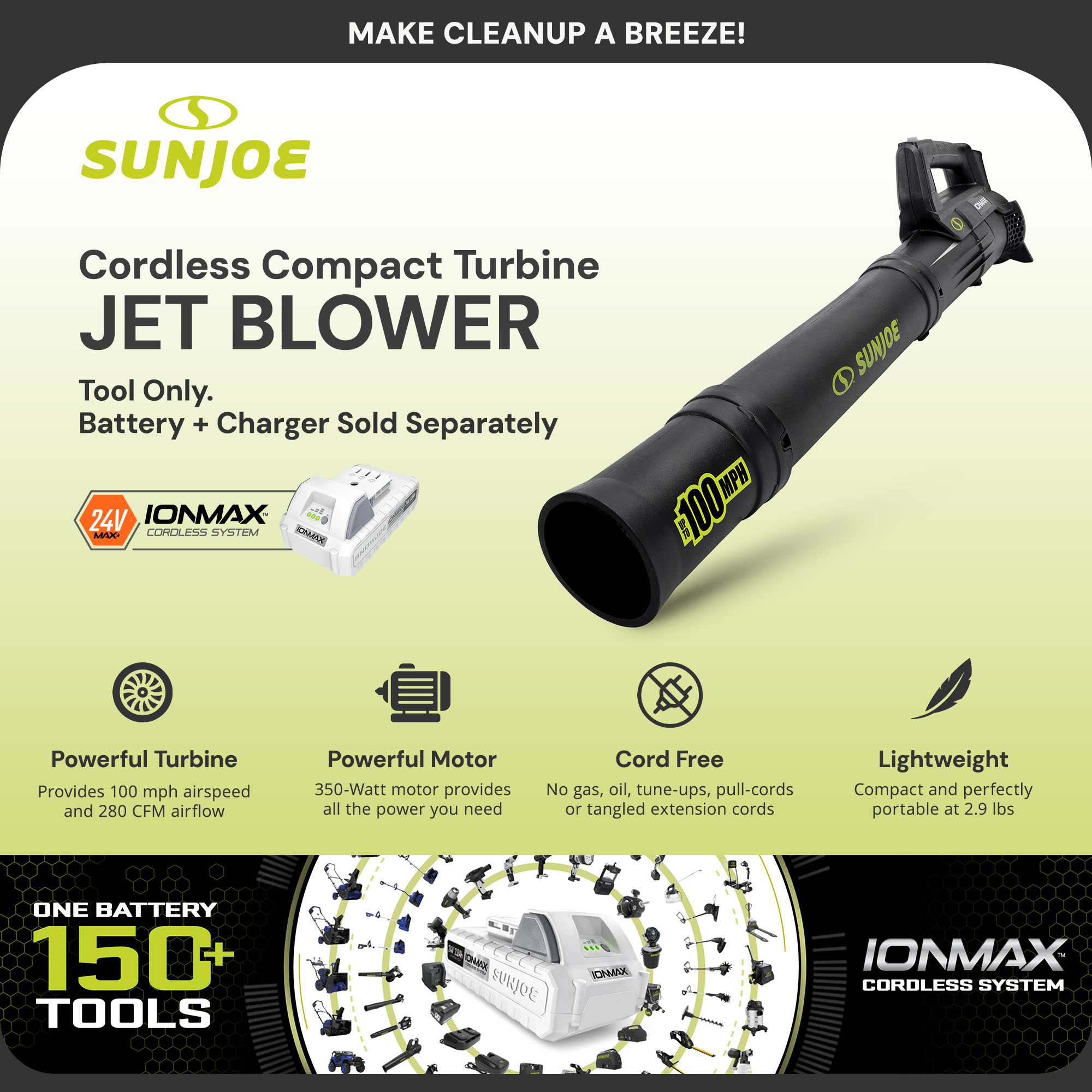 Whether you're maintaining your yard or clearing light debris from your outdoor spaces, the Sun Joe 24V-TB-LTE 24-Volt Jet Leaf Blower is the perfect combination of power, portability, and convenience. Get yours today and experience the ultimate in cordless, lightweight, and high-performance yard care!