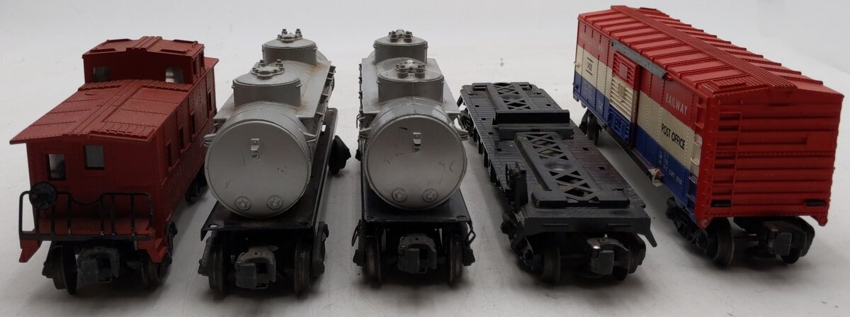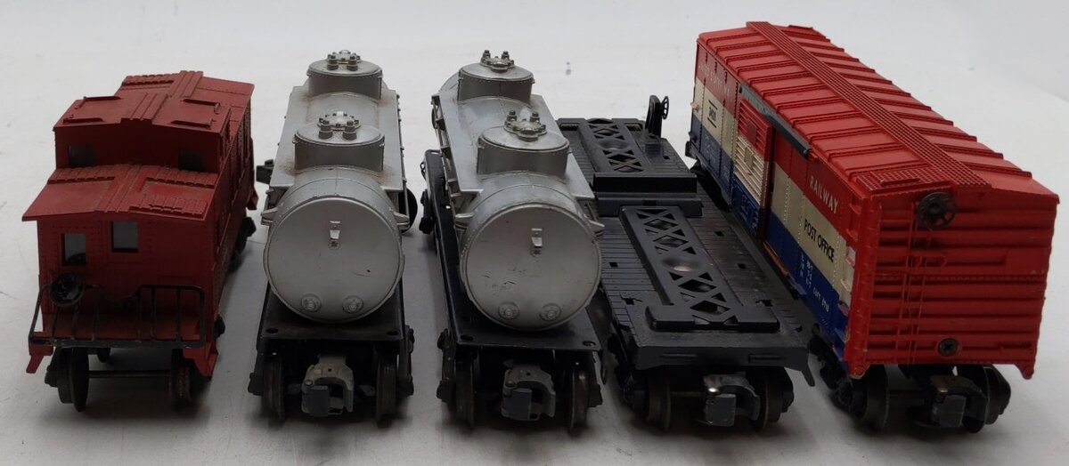 This item has been graded per TCA standards C-6: Very Good. These cars show scratches and spots of paint loss throughout various sections of the shell and chassis. These cars show spots of rust on the chassis and trucks. The lionel 6357 trim pieces are bent. The lionel 3428 is missing one of the nails and previous owner has put tape on it. The lionel 3428 has no mailman or mailbag inside of the boxcar. The overall appearance of each item may be improved with a gentle and thorough cleaning. The instruction manual is not included. The original box is not included. Please check the photos for a detailed look at each item. Overall condition is Very Good.