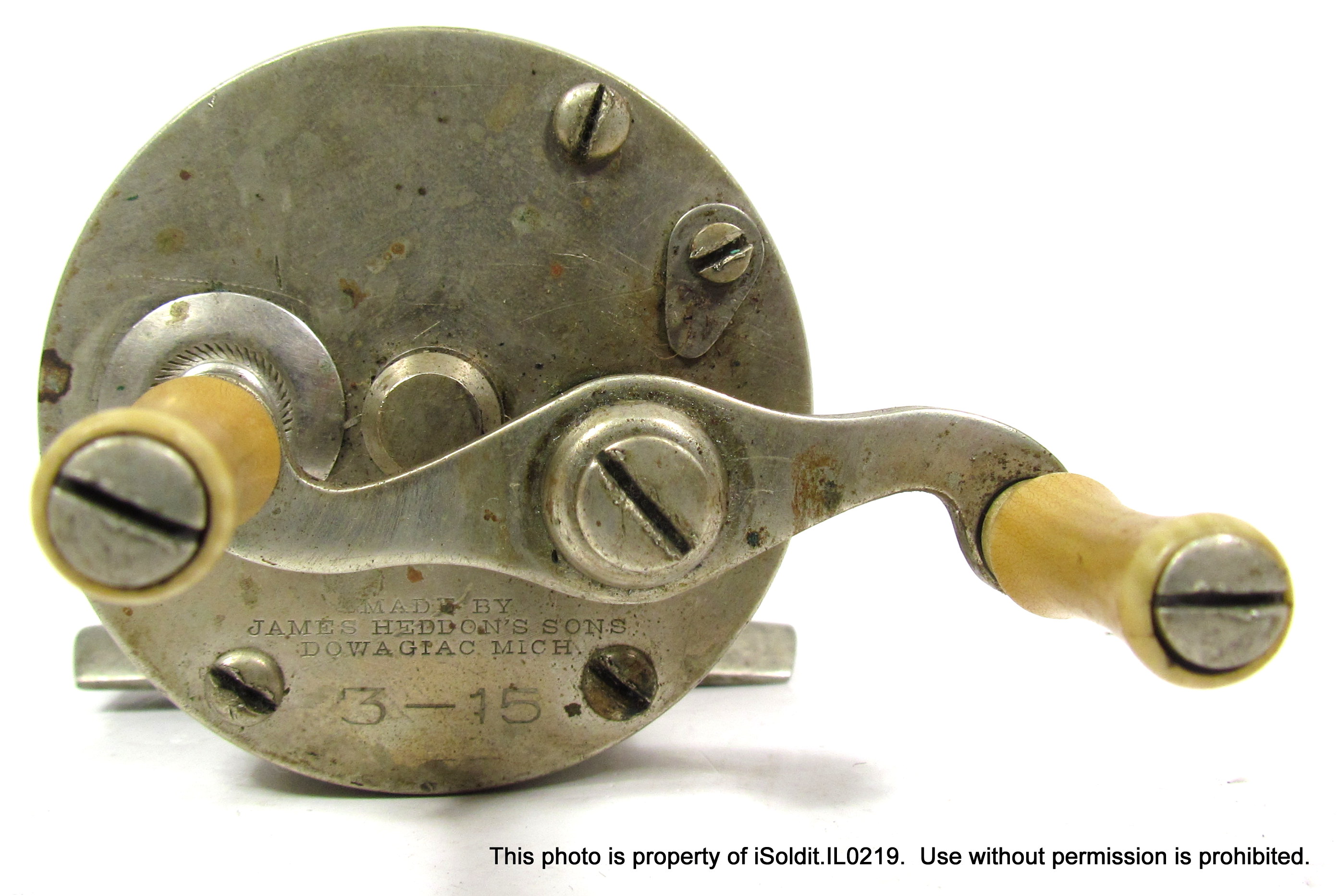 Offered here is a Vintage/Antique James Heddon's Sons 3-15 Baitcasting Fishing Reel.