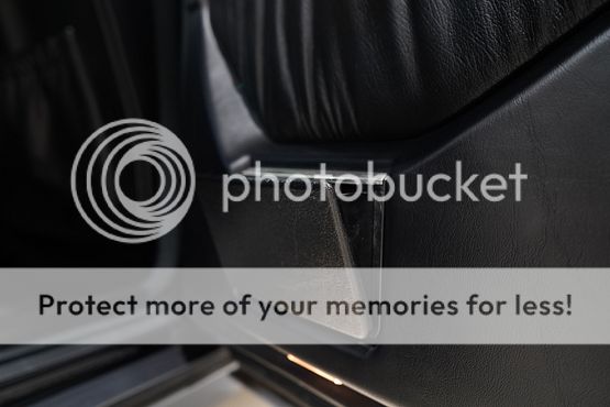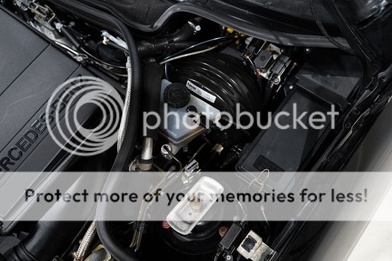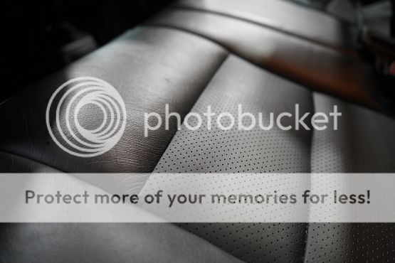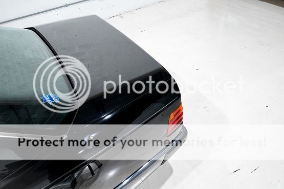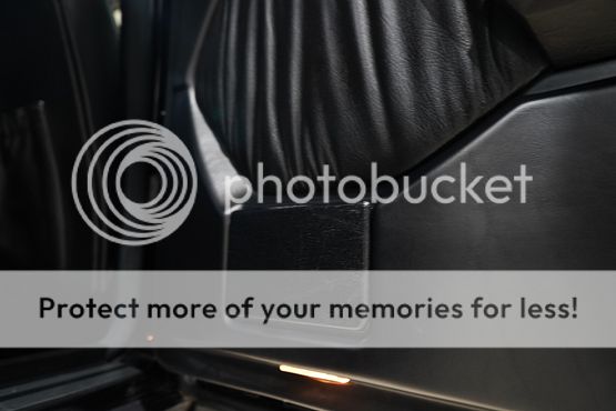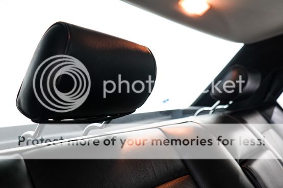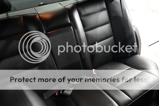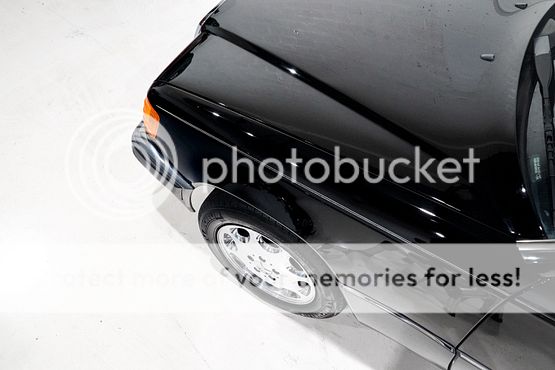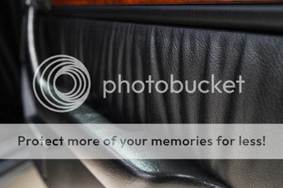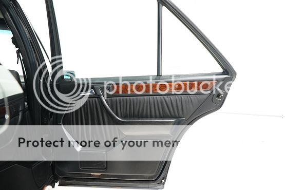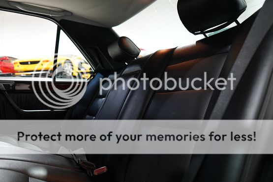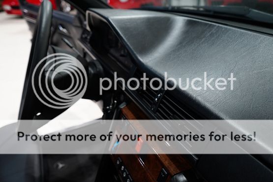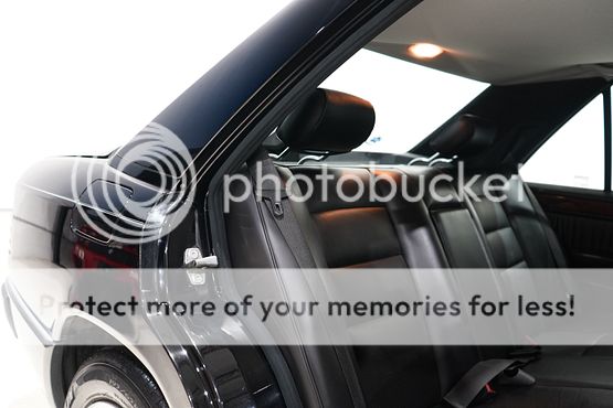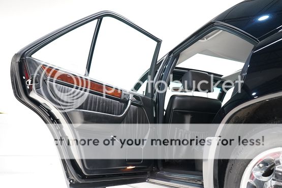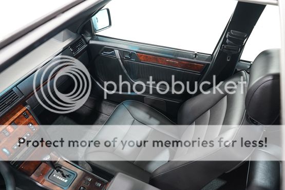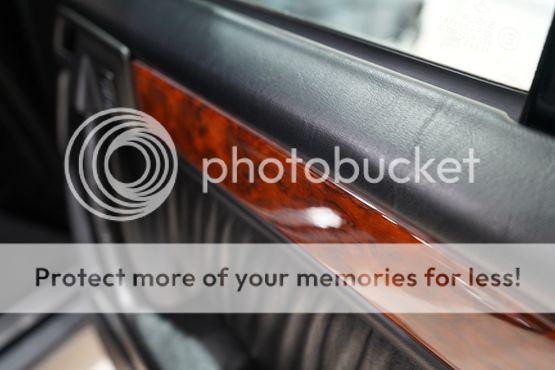 The cabin features seating upholstered in black leather along with wood trim and a color-coordinated lower dashboard, center console, door panels, and carpets. Interior appointments include power-adjustable front seats, a cassette stereo, a remote CD changer, air conditioning, and cruise control.