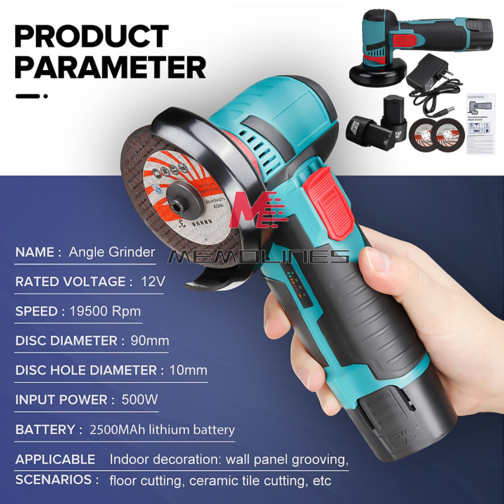 Motor: brushless motor Rated voltage: 12V Speed: 19500 rpm Disc diameter: 90mm Disc hole diameter: 10mm Input power: 500W Thread grinding: M5 Recommended ambient temperature: 0-+35°C Allowable ambient temperature: -20- + 50°C Battery capacity: 2500mAh Specifications: US, EU Weight: 0.7 kg