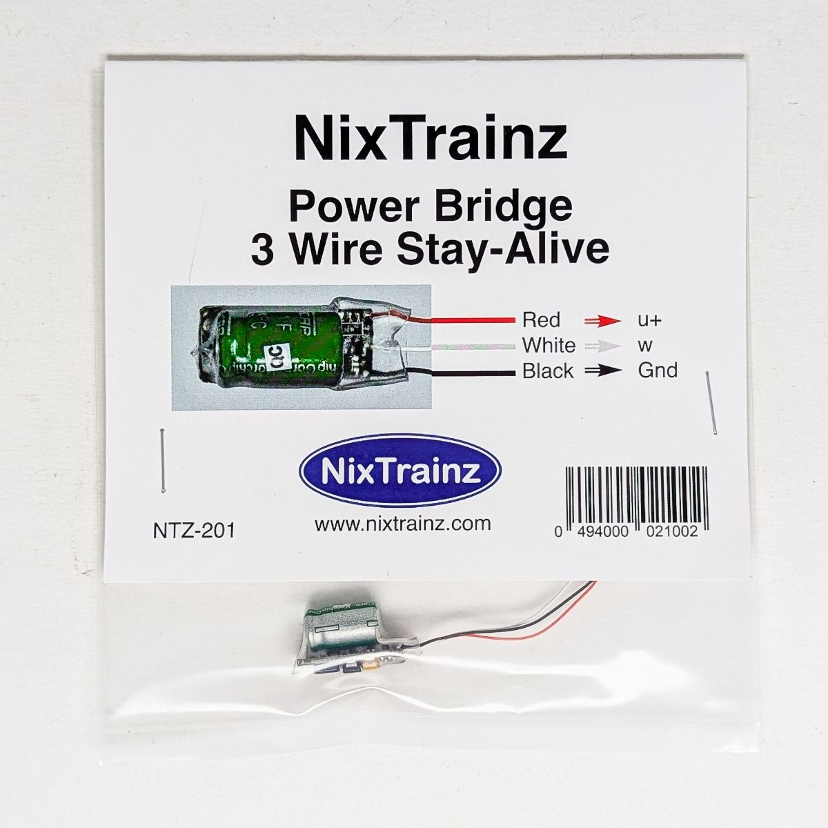This is a Nixtrainz NTZ-201 Power Bridge I 3 Wire Stay-Alive. Features: 3-wire stay alive device compatible with ESU LokSound decoders. Dimensions: L: 21mm W: 10mm H: 13.5mm.