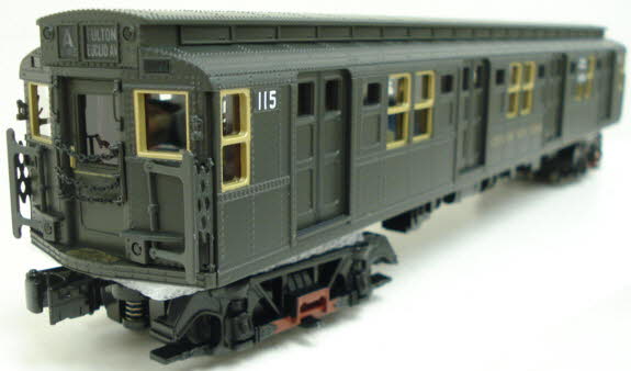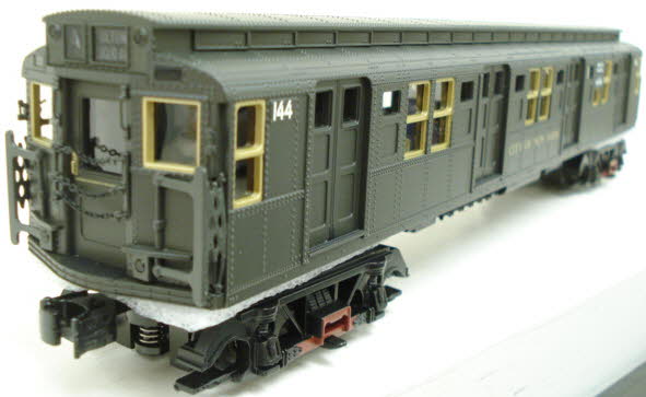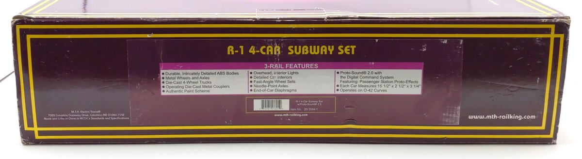 Thiis is an MTH 20-2554-1 O Premier R-1 Subway Passenger Set w/Proto-Sound 2.0 (Set of 4) from 2004. Each car features a durable ABS body, an illuminated interior, a detailed interior, die-cast trucks with operating metal couplers and each car measures 15 1/2 inches long.