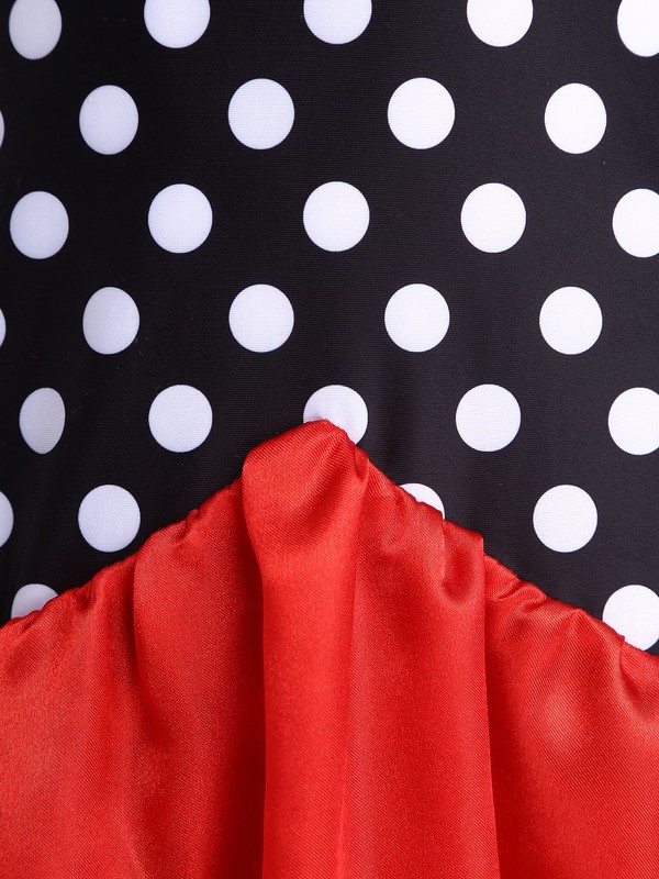 Designed with polka dots print, fringe around neck, and color block patchwork at collar, cuffs, and ruffle .