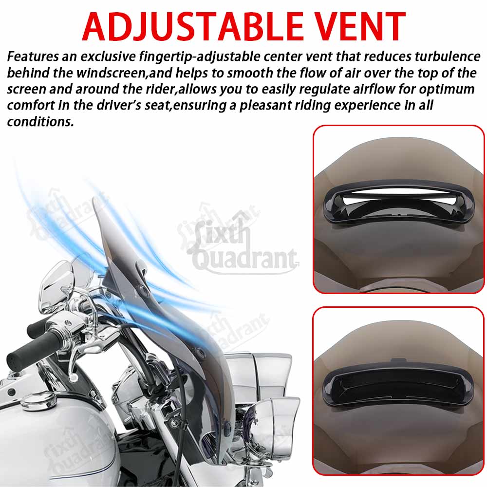 4.Features an exclusive fingertip-adjustable center vent that reduces turbulence behind the windscreen,and helps to smooth the flow of air over the top of the screen and around the rider,allows you to easily regulate air-flow for optimum comfort in the driver's seat,ensuring a pleasant riding experience in all conditions.