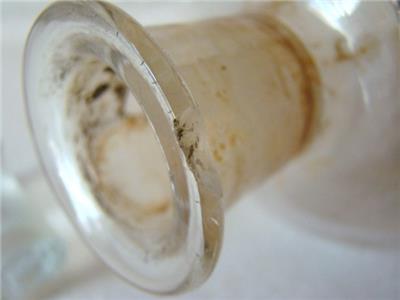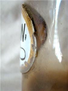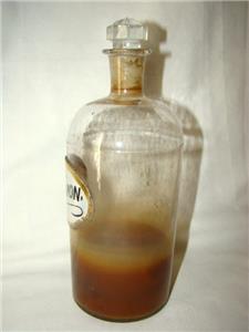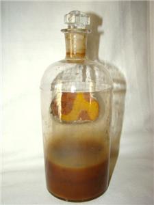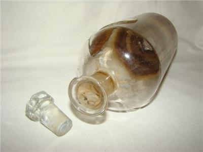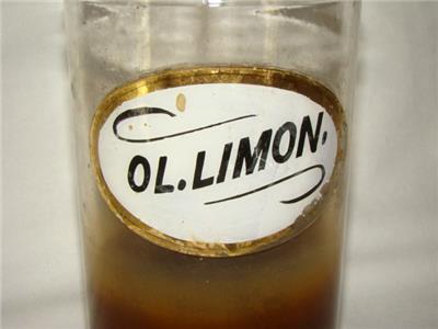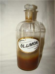 Wonderful antique pharmacy or apothecary glass jar measuring 10" in height. Featuring a hand blown round jar with banded shoulder, original stopper with both ground edge and collar, it is decorated with an old oval glass label marked OL. LIMON. accented in gold with black lettering on a cream ground. Bottle condition is very good with a minor chip off the top edge as shown - stopper has roughness and nipping around the molded dome top edge, label has light staining and age related wear, and bottle shows residue on the interior bottom third from contents drying within the jar - I did not try to remove or clean this. None of these minor issues detract -- bottle bears a rough pontil and probably came out of an old apothecary or pharmacy. Just a wonderful antique bottle - it has the look! Fun addition to any collection or display!