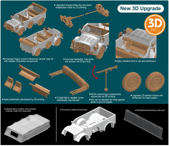 We upgraded the classic 1/72-scale Horsey 40 heavy military personnel transport vehicle through 3D printing technology. The original injection-molded parts and redesigned high-precision 3D printing parts gave this small-scale convertible military vehicle unprecedented detail performance and completely different production experience. The upgraded version is a 2-in-1 version, and the model maker can choose to make the soft roof in the stowed state or the unfolded state according to the requirements.