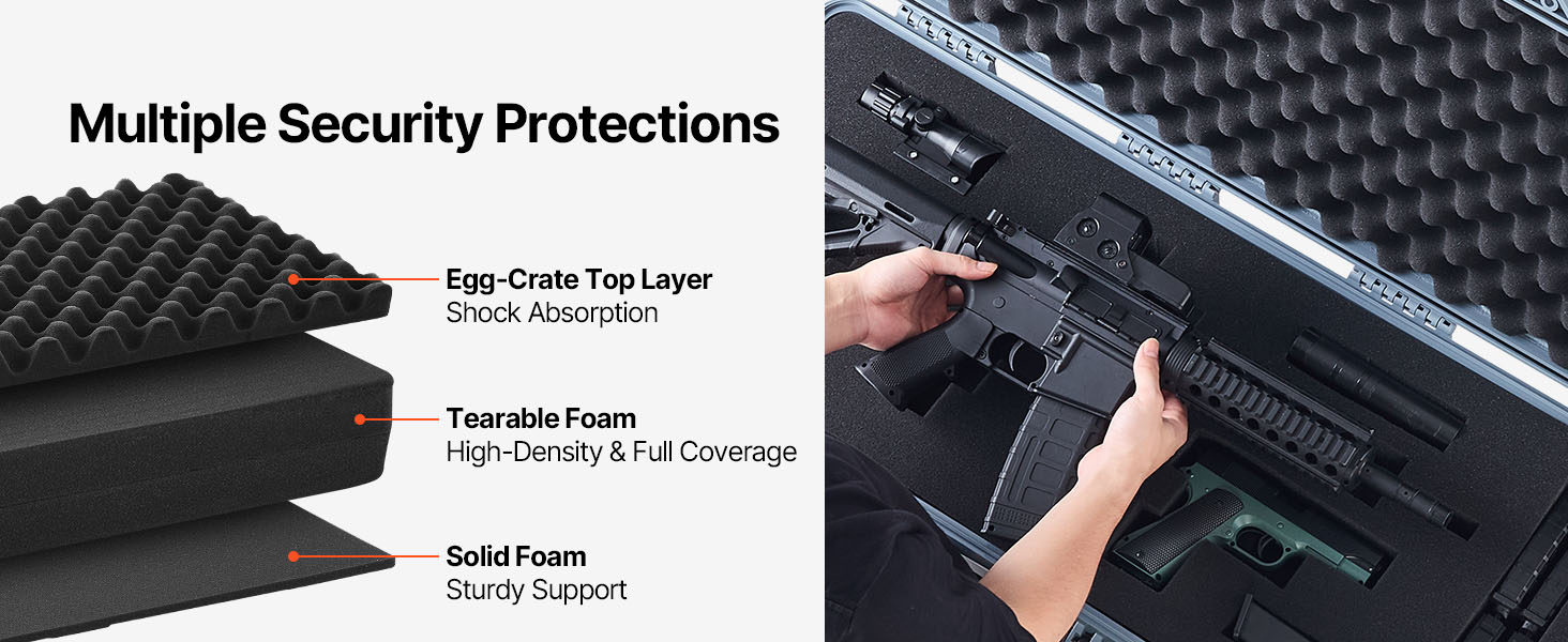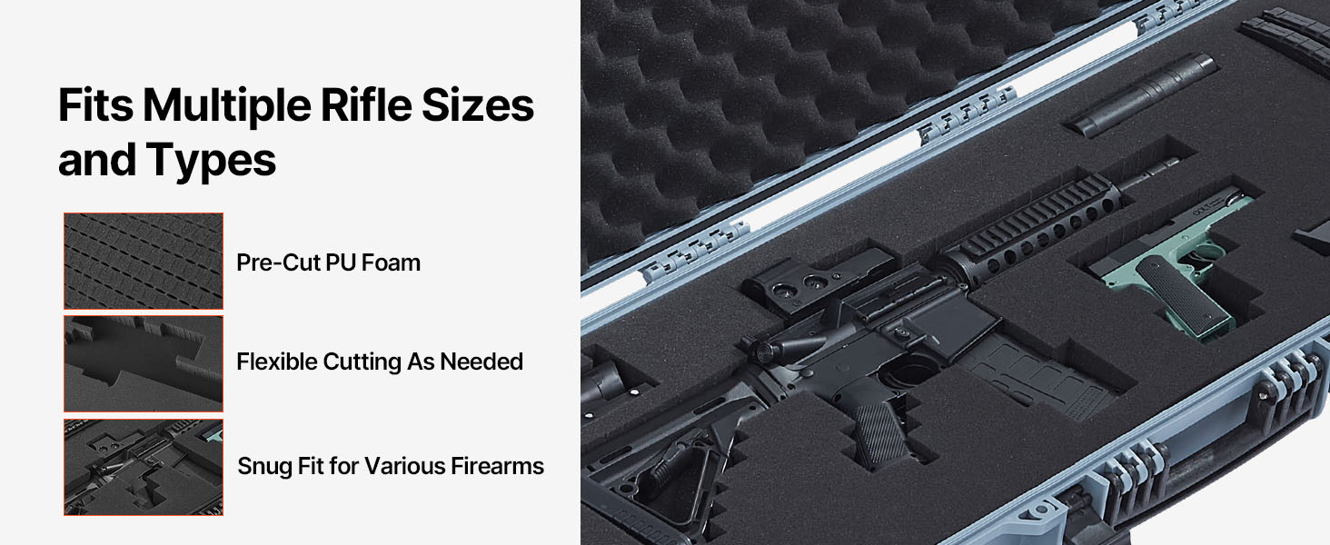 - Schiuma a 4 strati: la nostra custodia per fucile è realizzata con 4 strati di schiuma morbida. Puoi personalizzare gli scomparti per adattarli alla forma del tuo fucile