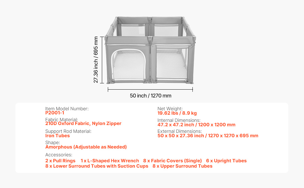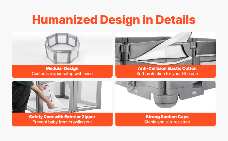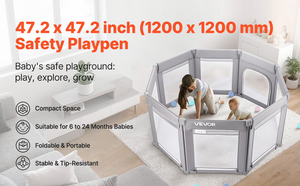 Spazio di gioco sicuro: il box per bambini compatto VEVOR da 47,2 x 47,2 pollici (1200 x 1200 mm di dimensioni interne) offre un'area di gioco sicura per bambini dai 6 ai 24 mesi. Offre ampio spazio al bambino per gattonare, stare in piedi