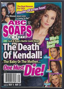 ABC Soaps in Depth Magazine May 23, 2006. Zach and Ryan's Battle Could Mean The Death of Kendall On Cover. Articles inside include Colin Egglesfield, Aiden Turner, Tad and Dixie, Finola Hughes, Natalia Livingston, Joseph C. Phillips, David Fumero, and more. Filled with great Stories and Pictures of all your favorite ABC Soaps. Magazine is in good condition, wear at edges, small tear at top edge