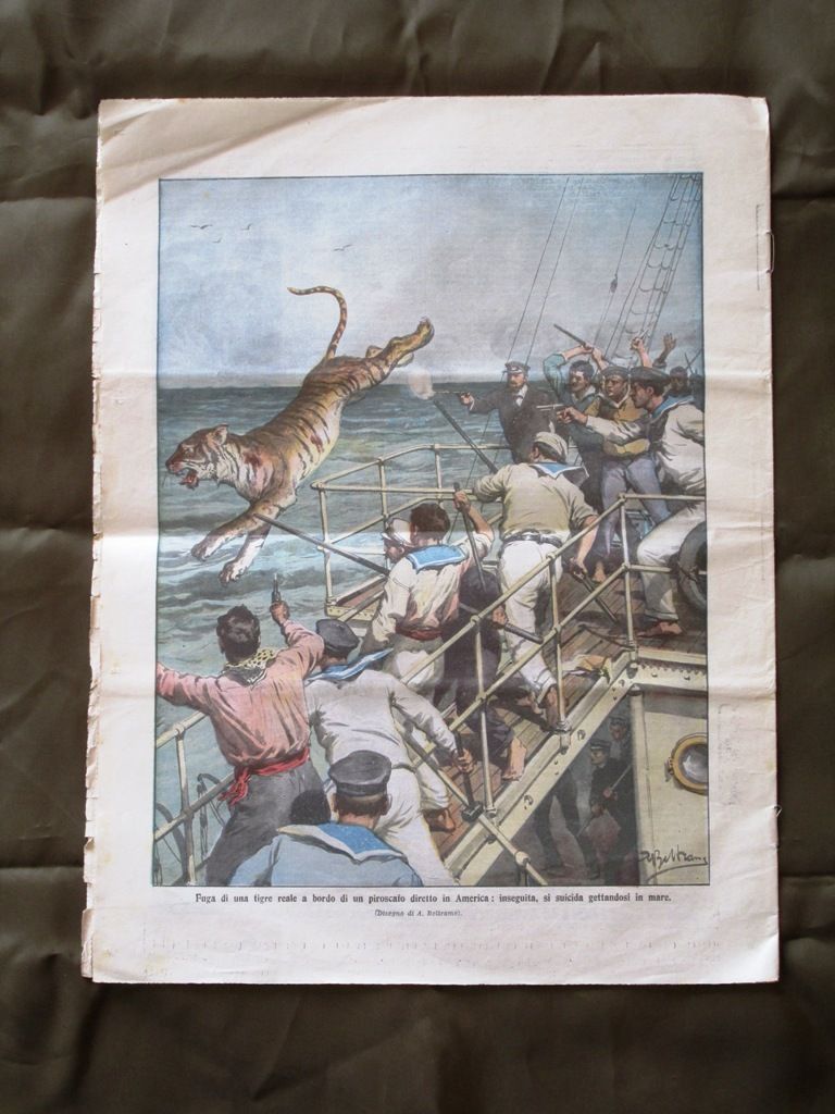 Fuga di una tigre reale a bordo di un piroscafo diretto in America: inseguita, si suicida gettandosi in mare.
