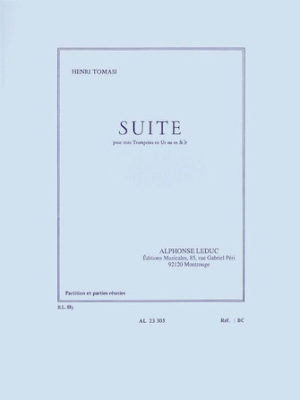 Suite is a piece for three Bb or C Trumpets composed by Henri Tomasi in 1964. This unusual suite lasts approximately 830 minutes. It is divided into three main parts: 1. Havanaise at a Tempo di Habanera, 2. Lento égéen and 3. Danse Bolivienne. The Havanaise is made of a danse part and a more melodious one. Its dialogue in between the Trumpets creates a counterpoint. In the second part, the three instruments alternate the theme with small variations and the last part, 3. Danse Bolivienne, is a toccata. This book features score and parts for Bb and C Trumpets. Henri Tomasi was a French composer, conductor and winner of the Grand Prix de Rome in 1927. He also composed a variety of concerti for Alto Saxophone and for Trombone, as well as some ballades.