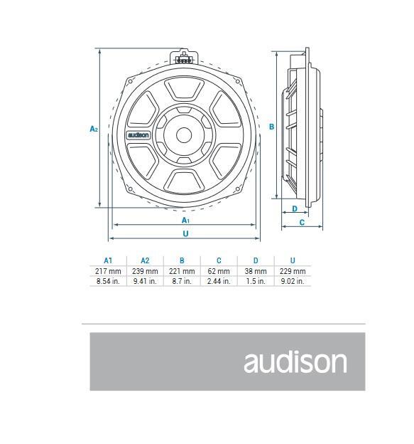 Audison verwendete einen spritzgegossenen Rahmen mit Graphitfasern (um die Steifigkeit zu erhöhen) und einen Neodym-Magneten für eine kleinere Größe (wichtig bei der Konfiguration mit umgekehrtem Magneten). Die 2"/5 cm Schwingspule ist die größte, die in einem BMW Ersatz-Tieftöner verwendet wird. Das Design mit umgekehrtem Magneten hat eine obere Entlüftung in der Stange, um die thermische Leistung und Belastbarkeit zu erhöhen. Die akustisch transparente Stoffabdeckung hält Schmutz von der Lautsprechermembran fern, wodurch ein verzerrter Klang unter dem Sitz verhindert wird.