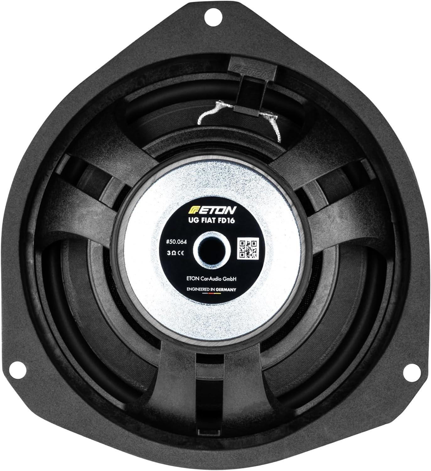 Der glasfaserverstärkte Polyamid-Kunststoffkorb im ETON typischen Doppelstrebendesign ist absolut passgenau und extrem verwindungssteif: Die offene Konstruktion sorgt auch für die nötige Kühlung des Antriebssystems, die durch die grosse Kernbohrung unterstützt wird. Dank 3 Ohm Schwingspulen- Technologie und der speziellen Konstruktion des Tieftöners, die ohne eine separate Tieftonweiche auskommt, ist der UG FIAT FD16 besonders wirkungsgradeffizient - auch in Kombination mit Werksradios!