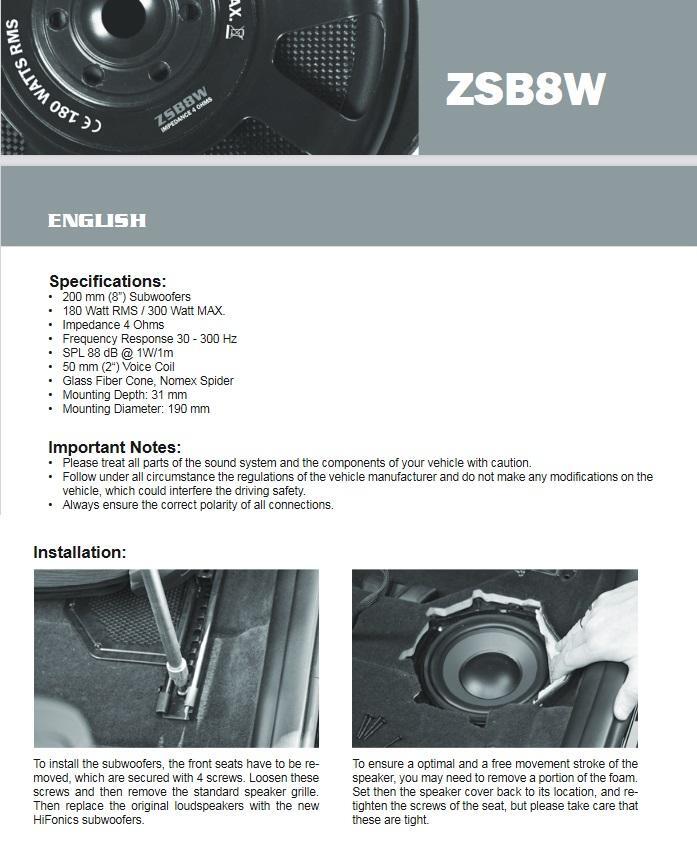 HiFonics bietet mit der ZEUS ZSB Serie erstmalig fahrzeugspezifische Lautsprecher für BMW/Mini. Besondere Highlights der ZEUS ZSB Serie sind unter anderem die aufwendig gefertigten Subs. Während herkömmliche Woofer oft mit günstigen, dafür aber schweren und wenig effizienten Ferrit-Magneten bestückt sind, bestechen die leichten ZSB8W Modelle mit modernen und hocheffizienten Neodym-Magneten. Diese Antriebsart sorgt in Kombination mit den großen 50 mm Schwingspulen und formstabilen Glasfasermembranen für kräftige und knackige Bässe! Auch bei den passgenauen 10 cm Lautsprechern kommen Neodym-Magnete zum Einsatz. Diese sind ebenfalls leicht und effizient und haben darüber hinaus eine geringe Einbautiefe. Komplettiert werden die Vollbereich-Lautsprecher mit feinzeichnenden Gewebe-Neodym-Hochtönern. Alle fahrzeugspezifischen Adapter, Kabel samt Einbauzubehör befinden sich im Lieferumfang, wodurch die Plug+Play Installation erheblich vereinfacht wird.