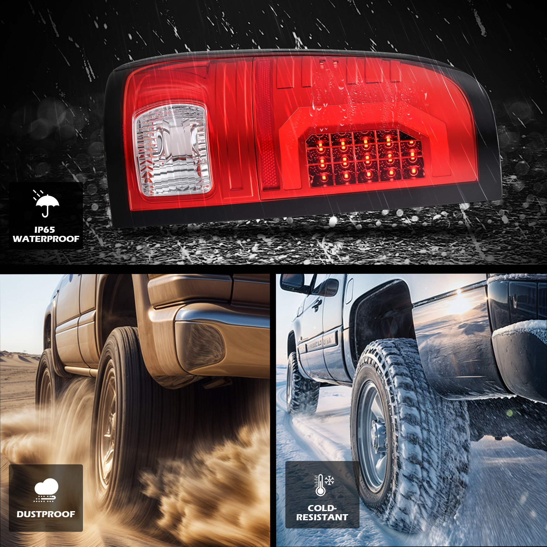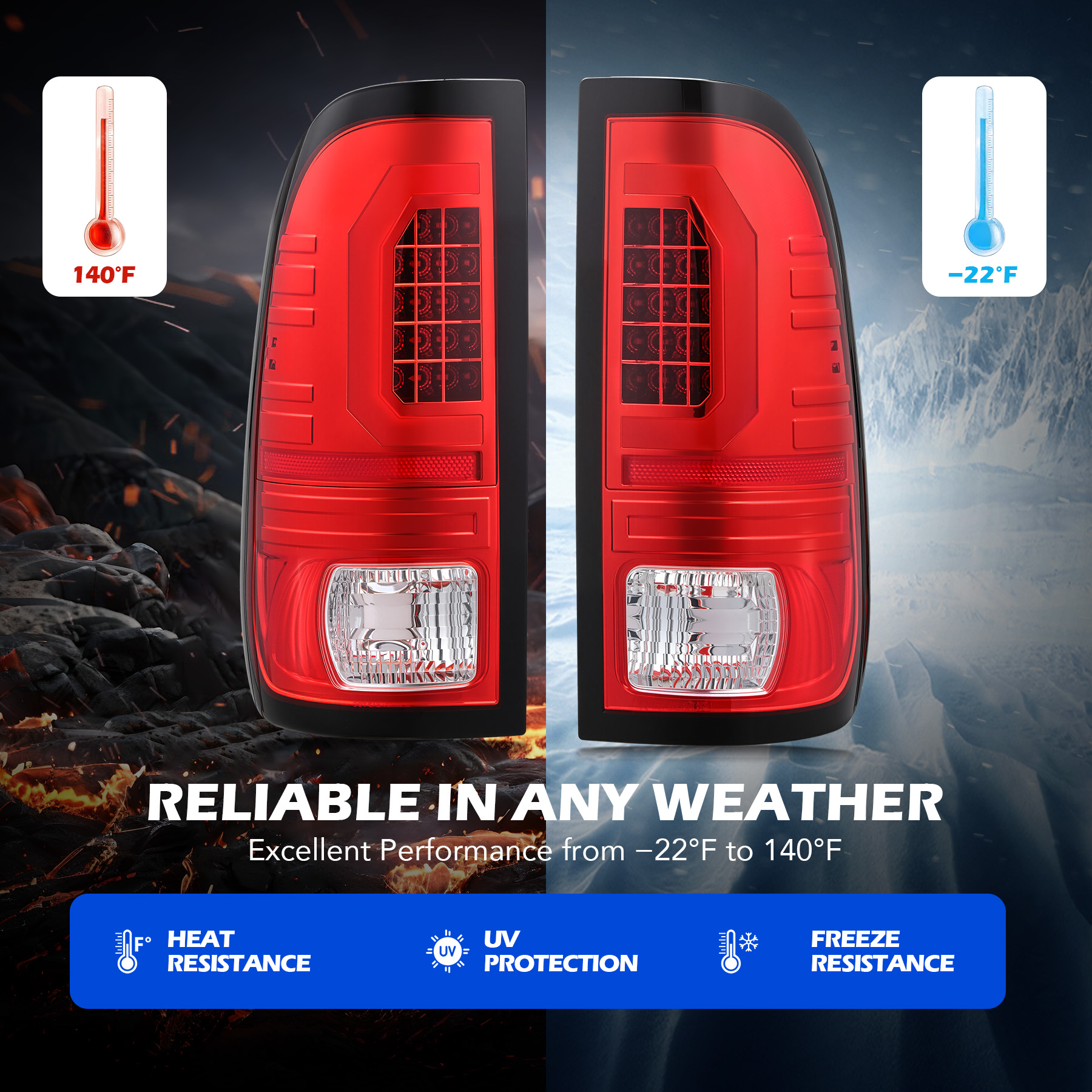Reliable in Any Condition: With polycarbonate lenses and polypropylene housings, our tail lights withstand elements and extreme temperatures from -22°F to 140°F without yellowing or cracking. The fully sealed design protects against water, dust, and fog