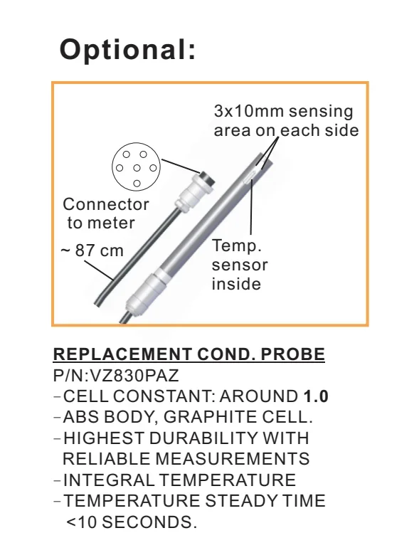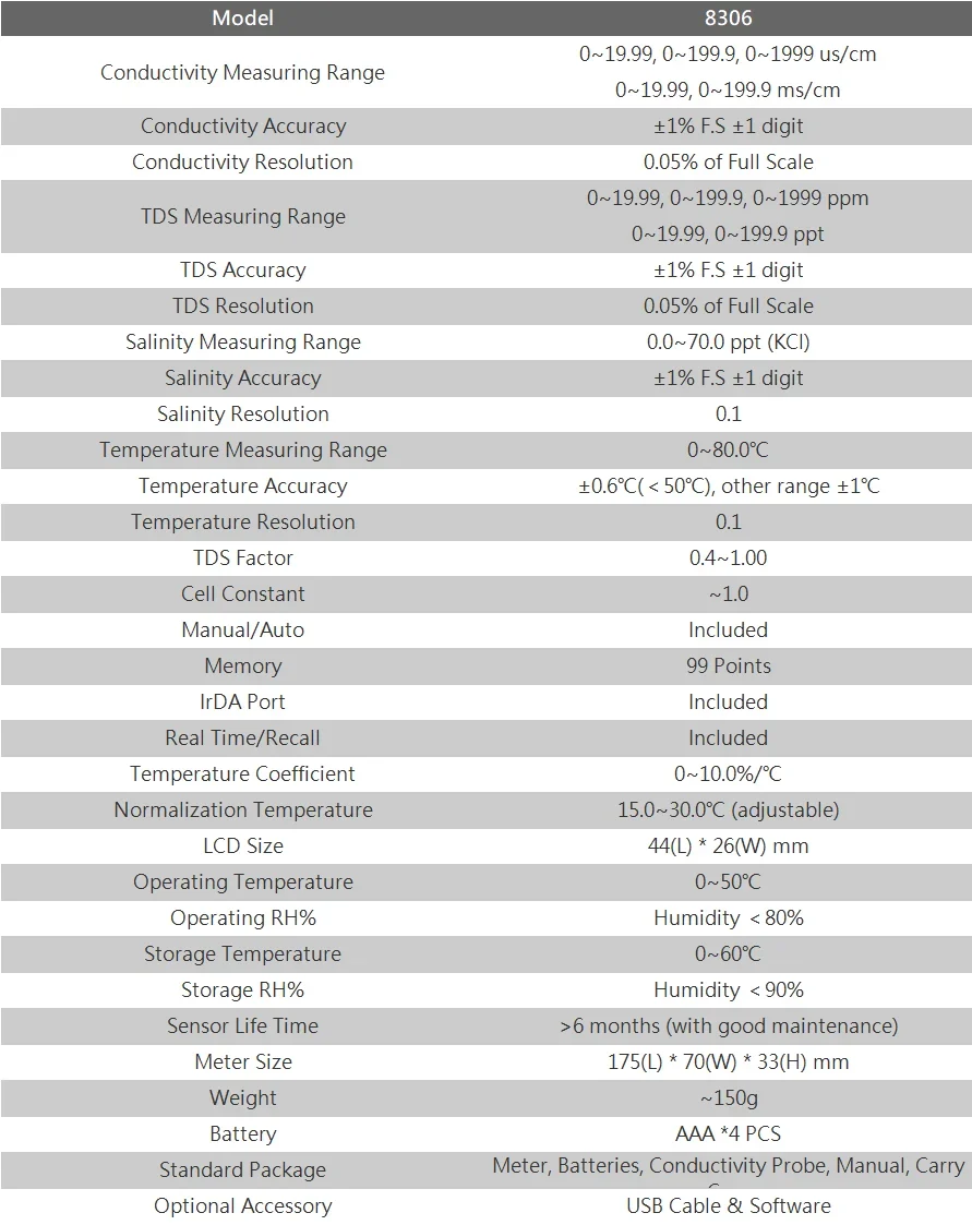 TDS Range 0~19.99, 0~199.9, 0~1999ppm;0~199.9ppt