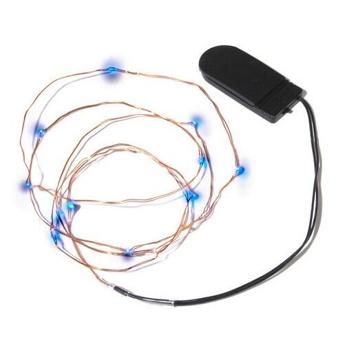 Moon Light Bright Blue Christmas LightsSet of 12 lightsLights are submersible (battery pack is not)Includes on/off switchSmall battery case, easy to hideCopper wire holds its shapeLED lights are rated at 25,000 hoursMade from copper, silver, glass, and plasticApproximately 4.5 feet long (1.4 m)Includes original manufacturers packaging – backer card (no box)Includes 2 replaceable CR2032 batteriesMade by Darice