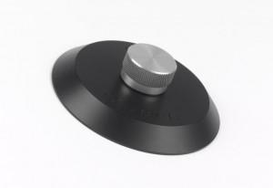 Black Delrin record clamp with anodised aluminium knob for use on Rega turntables
