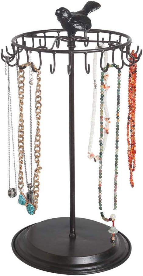 Rotating necklace and bracelet tree has 24 hooks and 1 cast bird