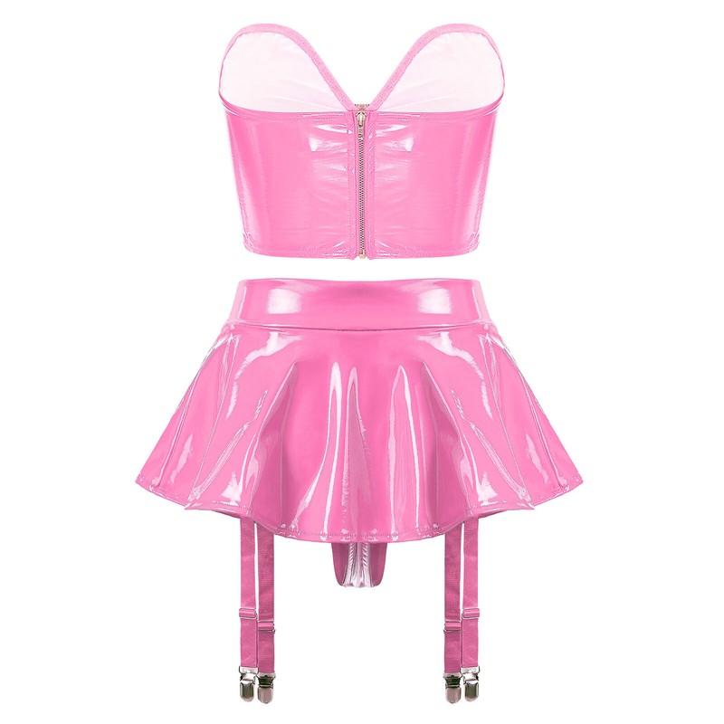 Crafted from a blend of patent leather, polyester, PU, nylon, metal, and spandex, the lingerie offers a combination of durability, stretch, and a luxurious feel against the skin.