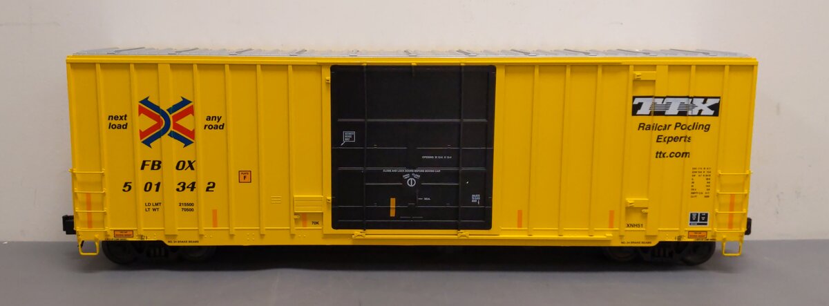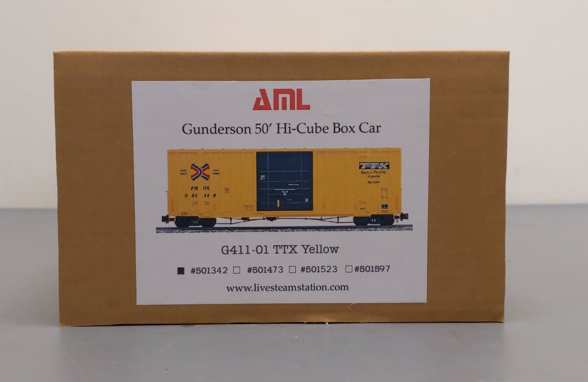 AML G411-01 1:29 Scale TTX Gunderson 50' Hi-Cube Box Car #501555 (Metal Wheels). This car features plastic construction, die cast metal sprung trucks, operating knuckle couplers, and metal wheels and axels.