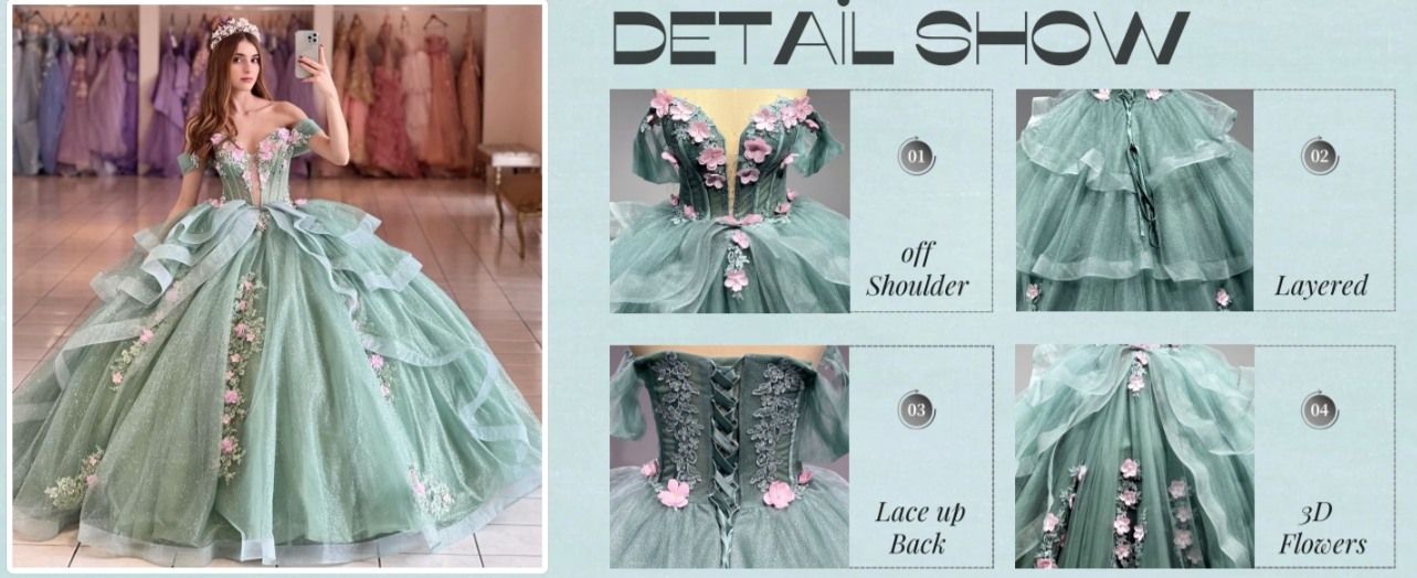 Occasion: Off shoulder Quincenera Dresses with bow ;Lace Appliques Ball Gowns; Princess Sweet 16 Dresses; Puffy Tulle Pageant Party Gowns, Floral Flowers Sweet 15 Dresses for Quincenera, and is Perfect for Prom Dress ,Holiday, Reception, Dancing Party, Graduation, Celebrity and other special occasions.