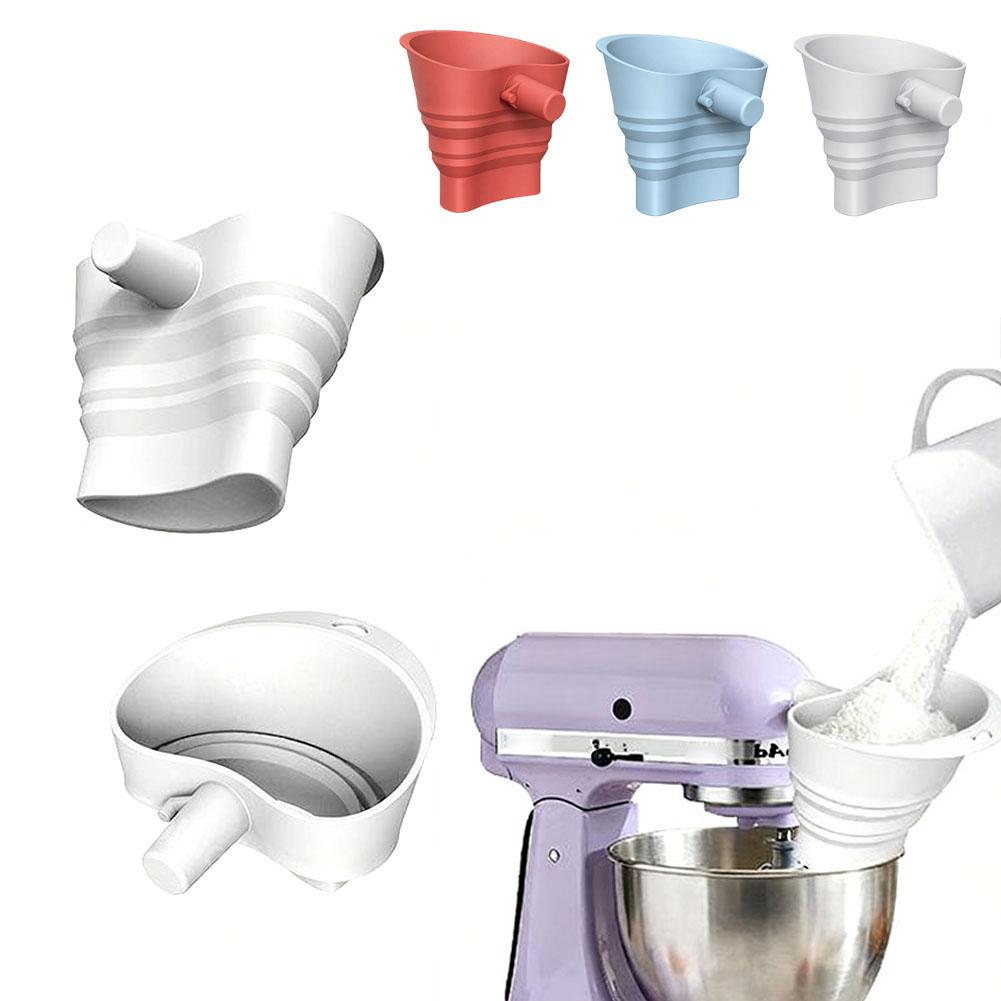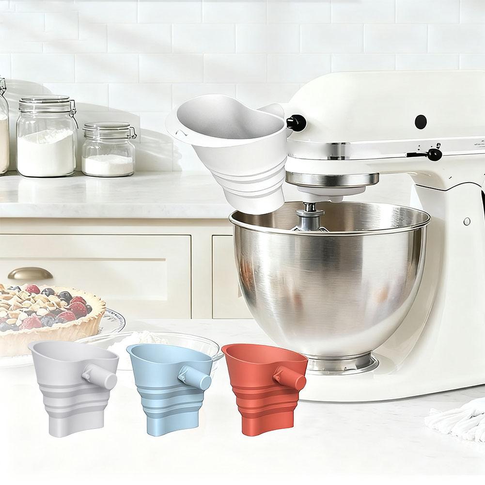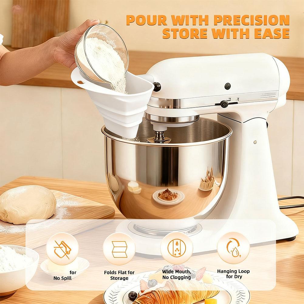 1. Simplify your baking process with the foldable funnel, which seamlessly attaches for KitchenAid tilt-head stand mixers (4.5-5 quart models, including the KSM150) for smooth, straightforward addition of ingredients without spills or guesswork. The foldable design stays out of the way while you add ingredients.