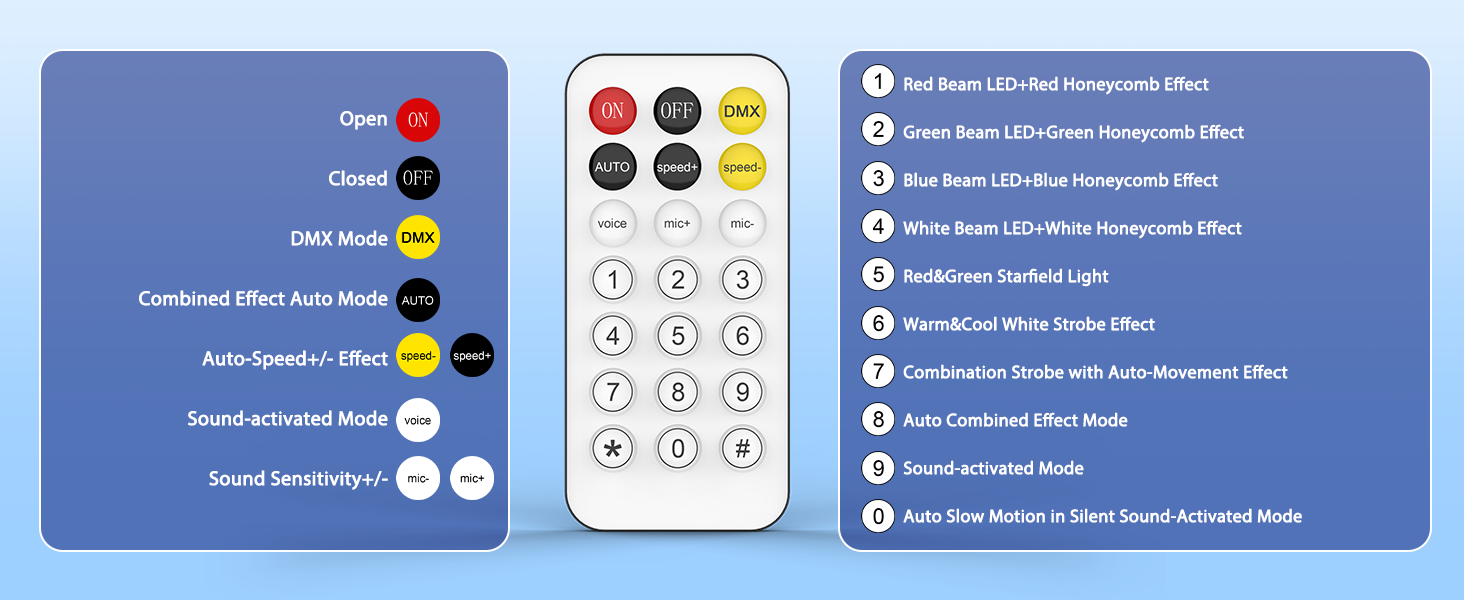 4. Multiple Control Options – Supports sound activation, auto-run, master/slave mode, DMX512, and remote control for effortless operation.