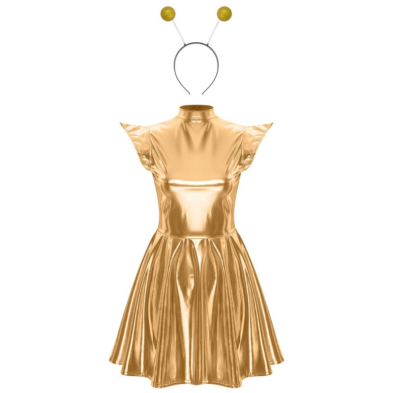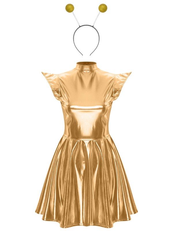 The metallic shiny fabric gives the dress a futuristic and eye-catching look, which is very much in line with the trendy aesthetic of today.