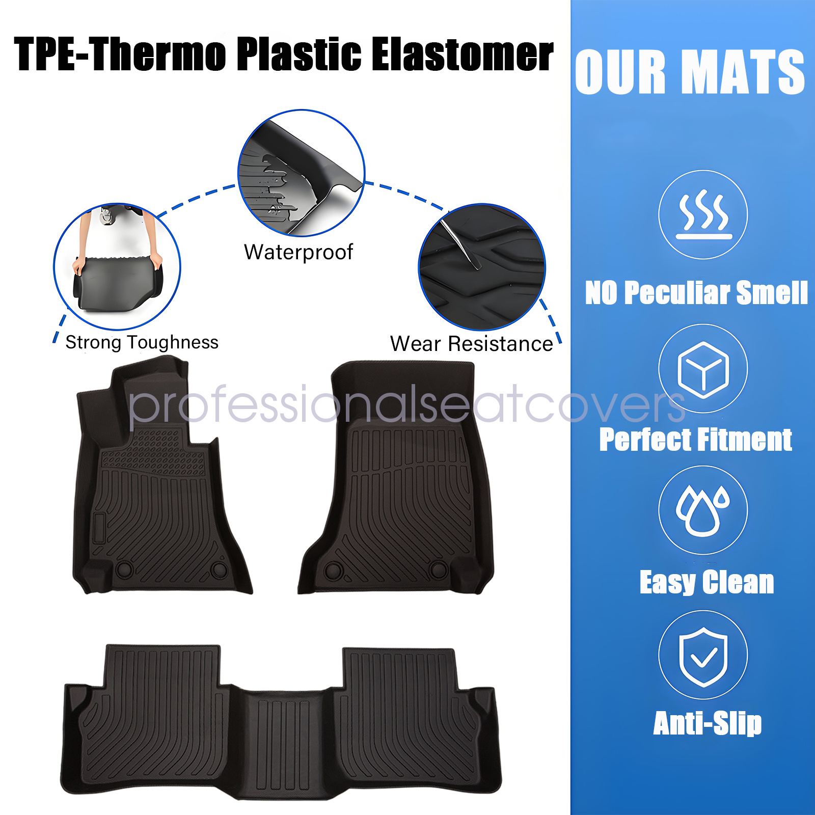 Soillar floor mats use elastic TPE (Thermoplastic Elastomer), No foul odor is produced even at high temperatures. soft touch and exquisite finish. This floor mats are skid-proof and recyclable.