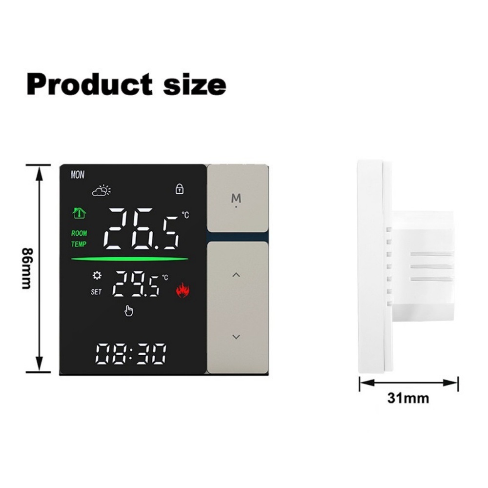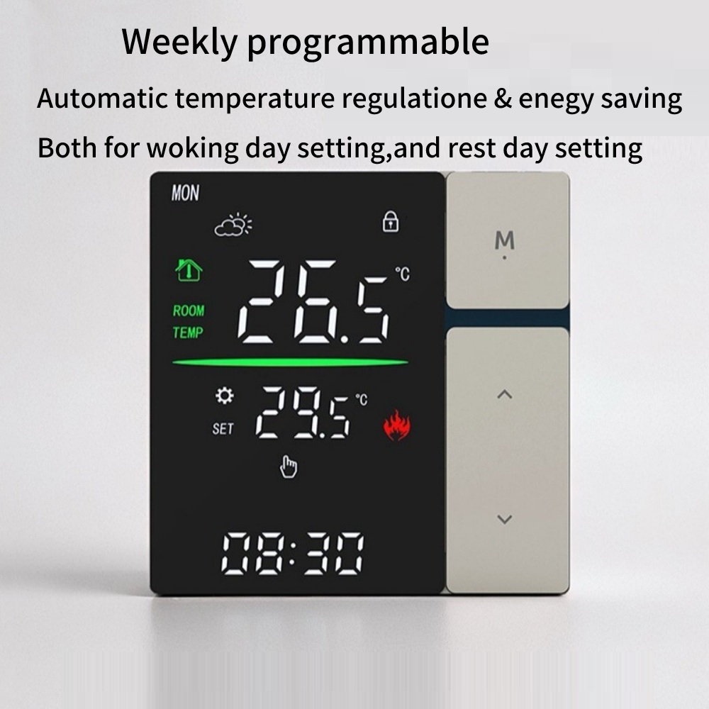Support 5+2 /6+1 / 7 days Weekly Programmable, six periods programmable controlling temperature setting.