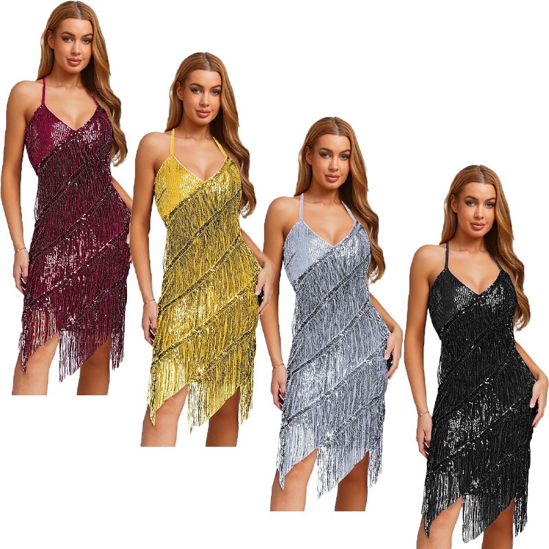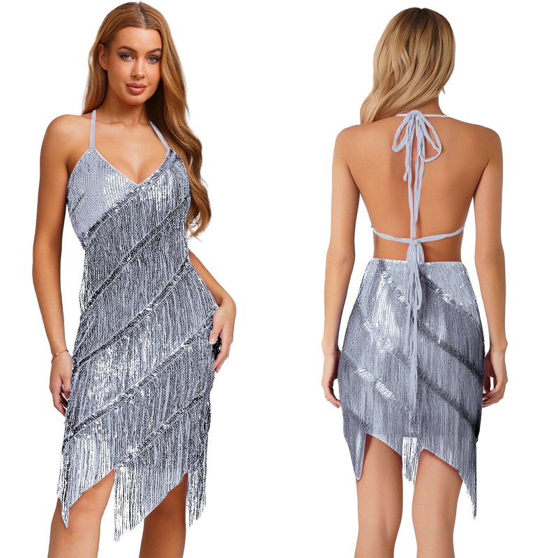 Tiered sequin tassels bring a dynamic and festive element to the dress, adding movement and glamour as you dance, creating a visually stunning effect.