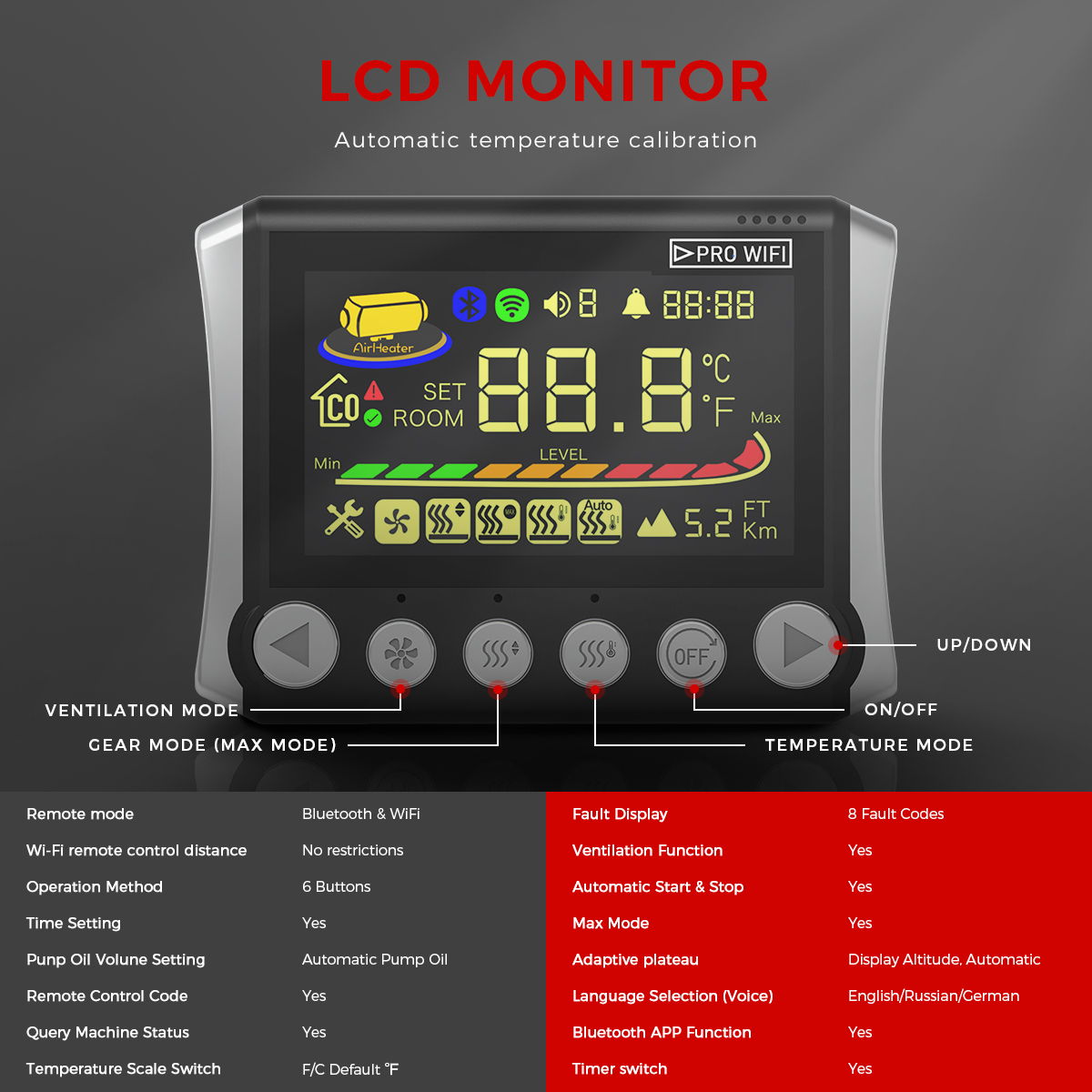LCD-Schalter mit Ein-Klick-Zugriff: Keine Tastenkombination erforderlich. Mit einem Klick haben Sie direkten Zugriff auf drei Modi: Belüftungsmodus, Gangmodus (Maximalmodus) und Temperaturmodus.Drei Steuerungsmethoden: Unsere verbesserte Dieselheizung verfügt über eine Bluetooth-Steuerung. Sie können die Heizung zum Vorheizen oder zur Temperaturregelung in einer Entfernung von bis zu 30 Metern steuern, indem Sie einfach die App herunterladen. Sie verfügt außerdem über eine Fernbedienung und ein LCD-Display, sodass Sie die für Sie passende Steuerung auswählen können. Der Temperatureinstellbereich beträgt 46 °F-95 °F/8 °C-35 °C, um Ihren unterschiedlichen Anforderungen gerecht zu werden.